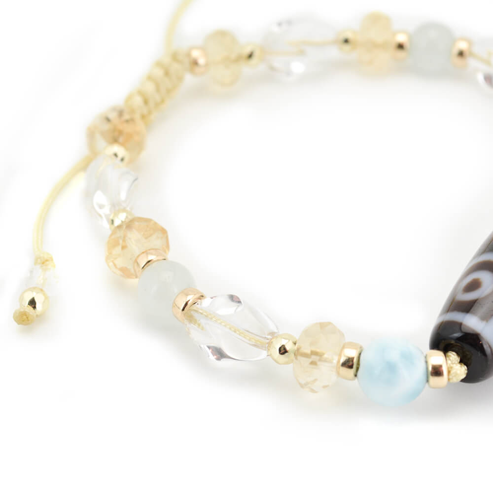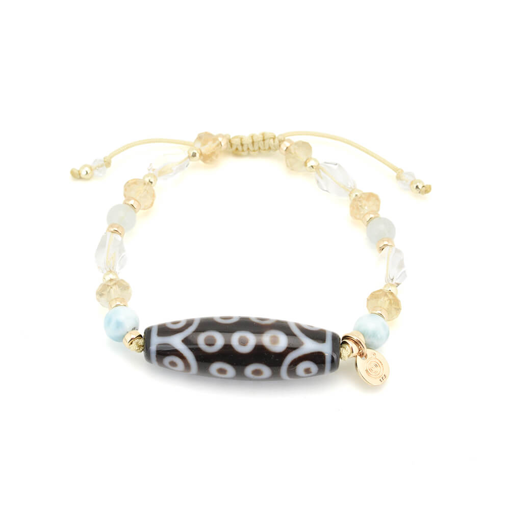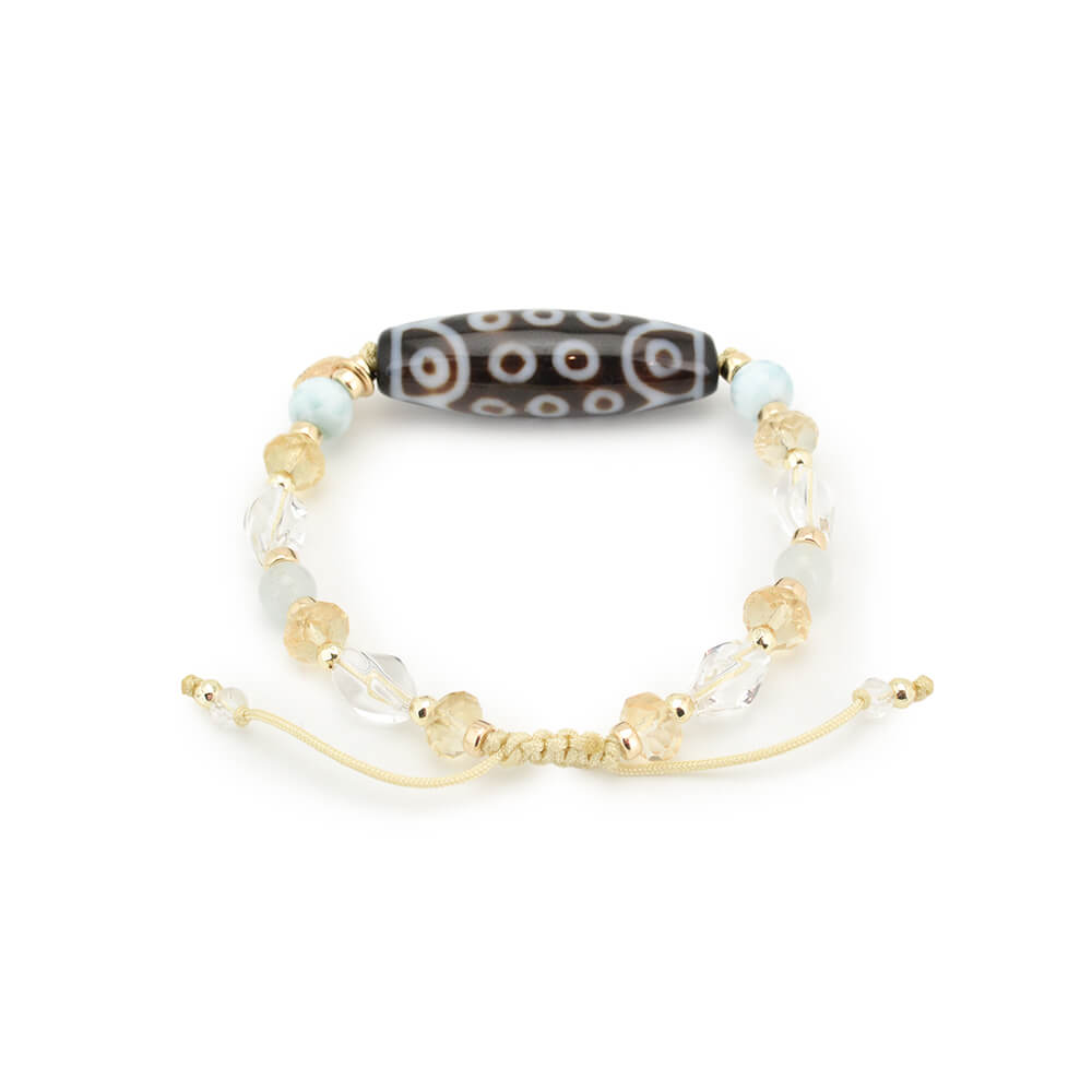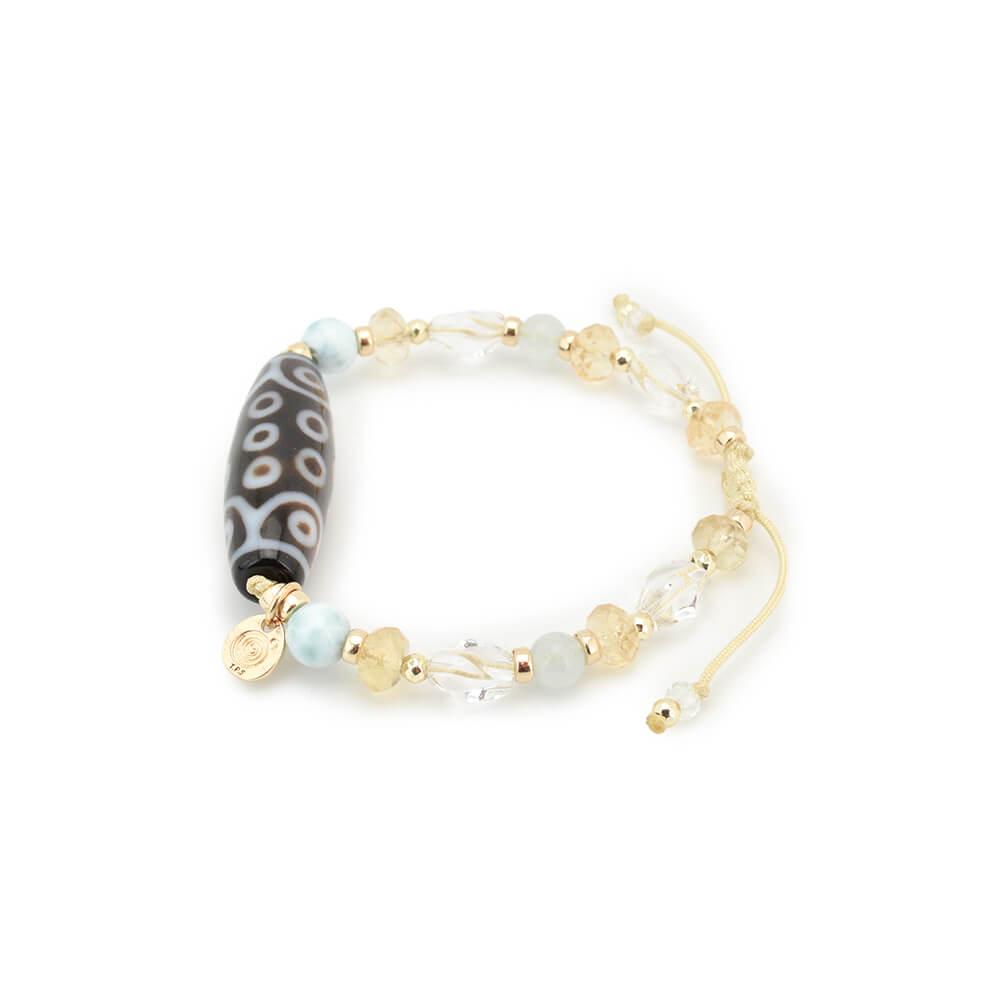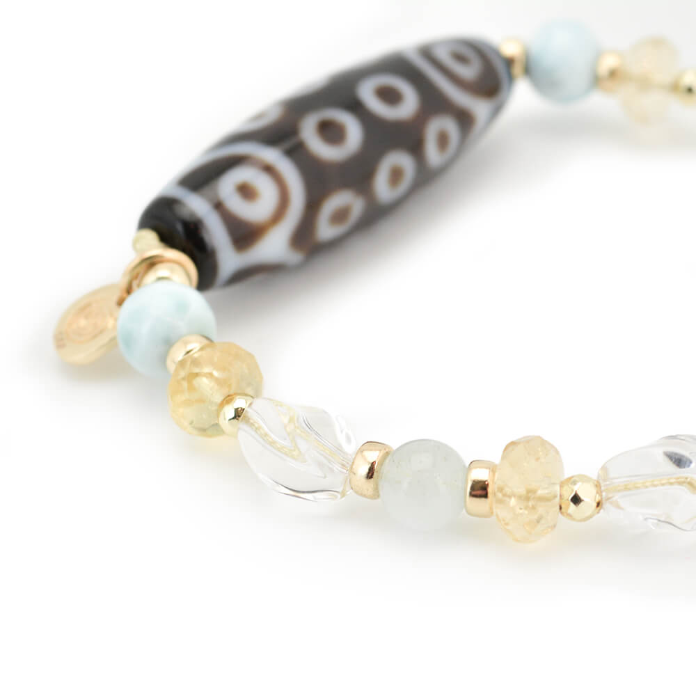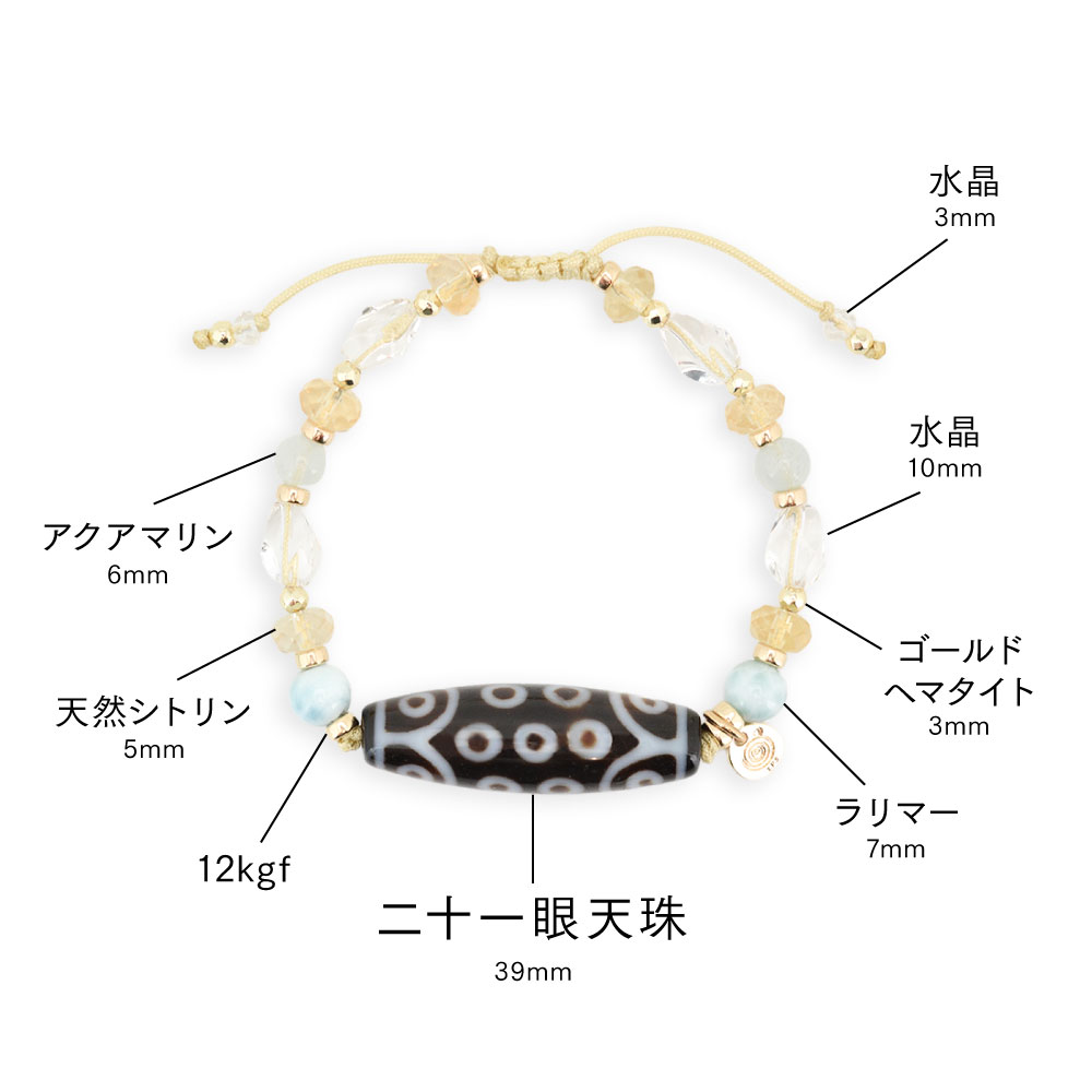 生命力強化・勇往邁進し、万事が意のまま順調に進むといわれている二十一眼天珠に、太陽を象徴する石とされ、商売繁盛・事業成功・金運・財運・貯蓄運アップによいといわれているシトリンなどを組み合わせたブレスレットです。