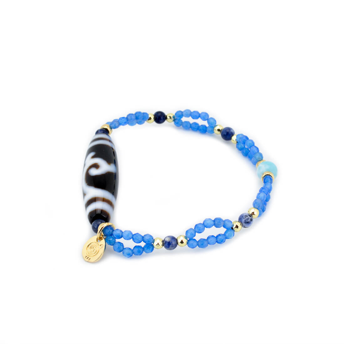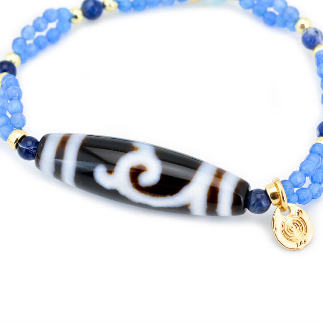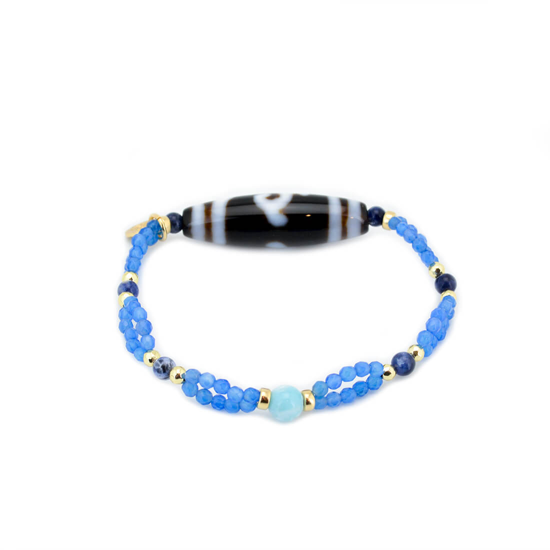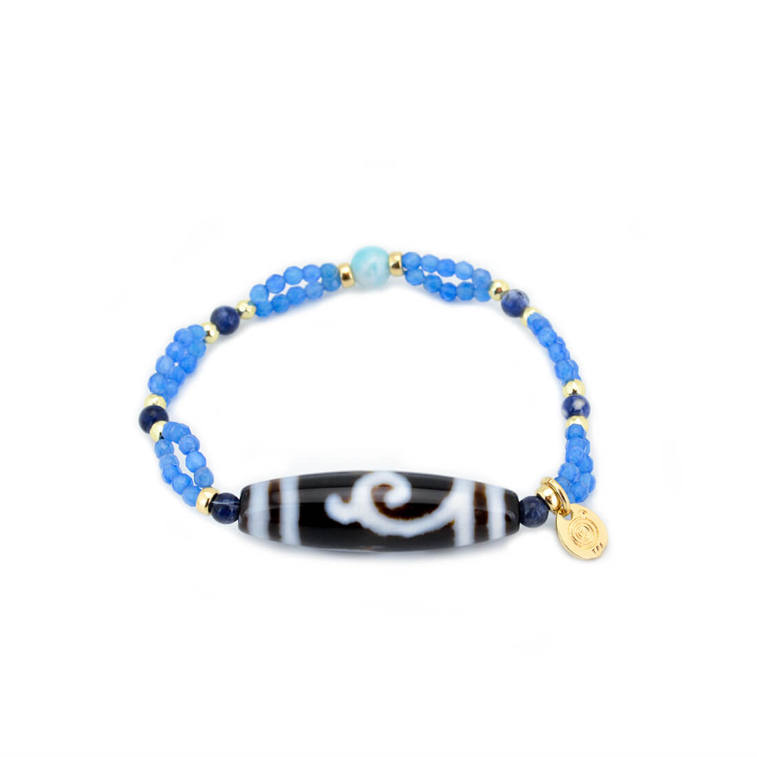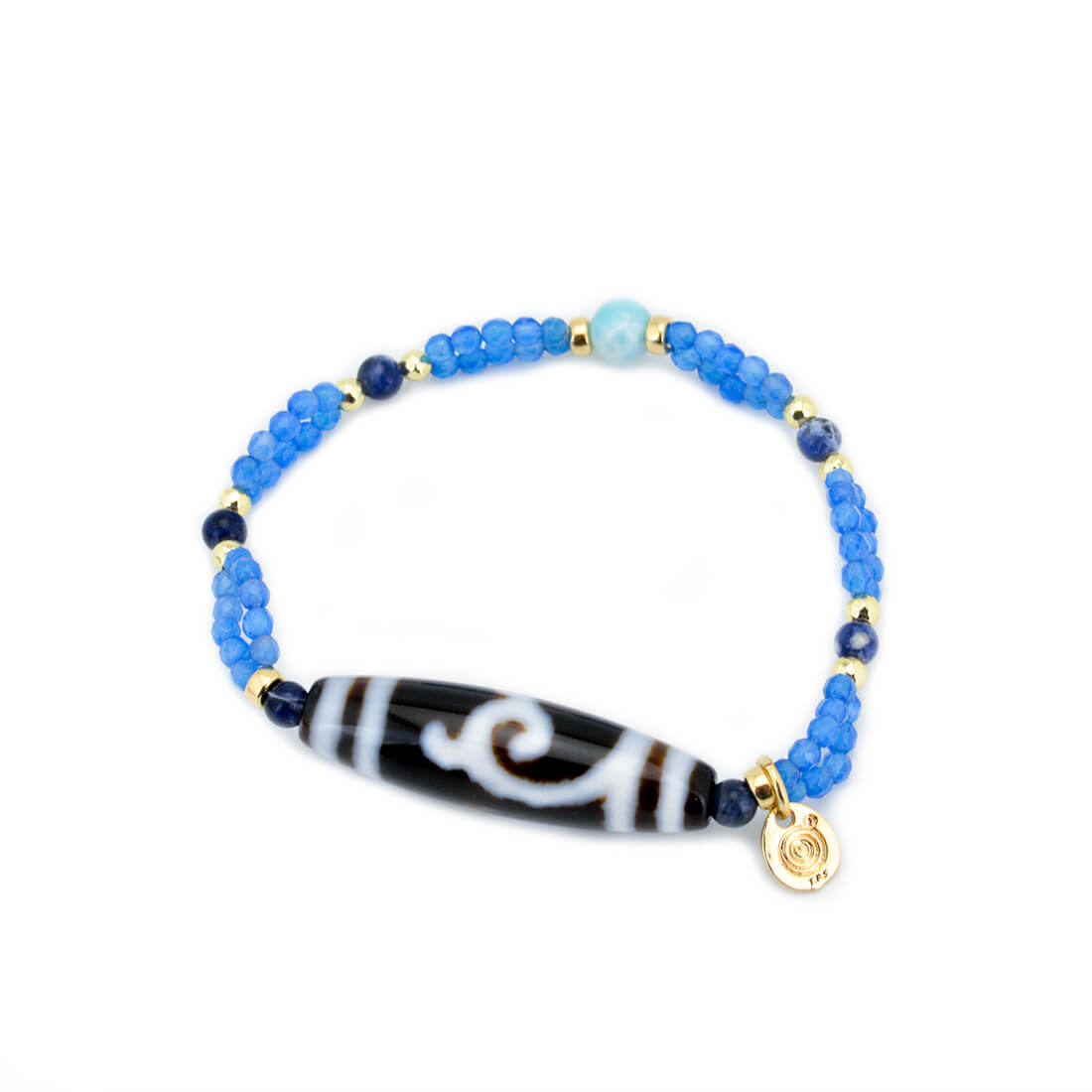 厄難を消除し運気を上げ、福を招き、願いをことごとく叶えてくれる稀少な天珠といわれている緑度母天珠に、愛と平和の石と呼ばれ、寛大な心へと導き正しく見極める力を持つとされるラリマーなどを組み合わせたブレスレットです。