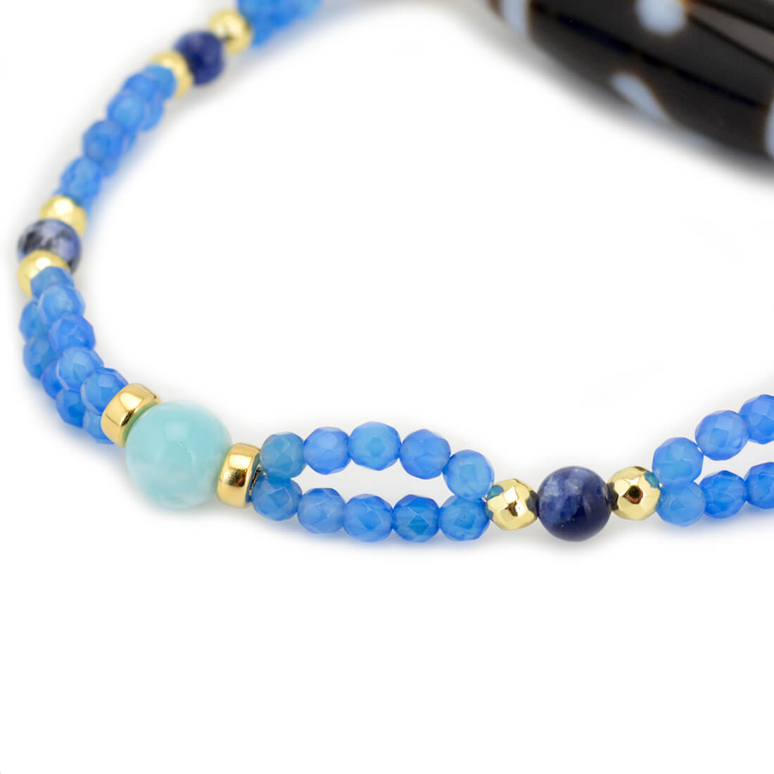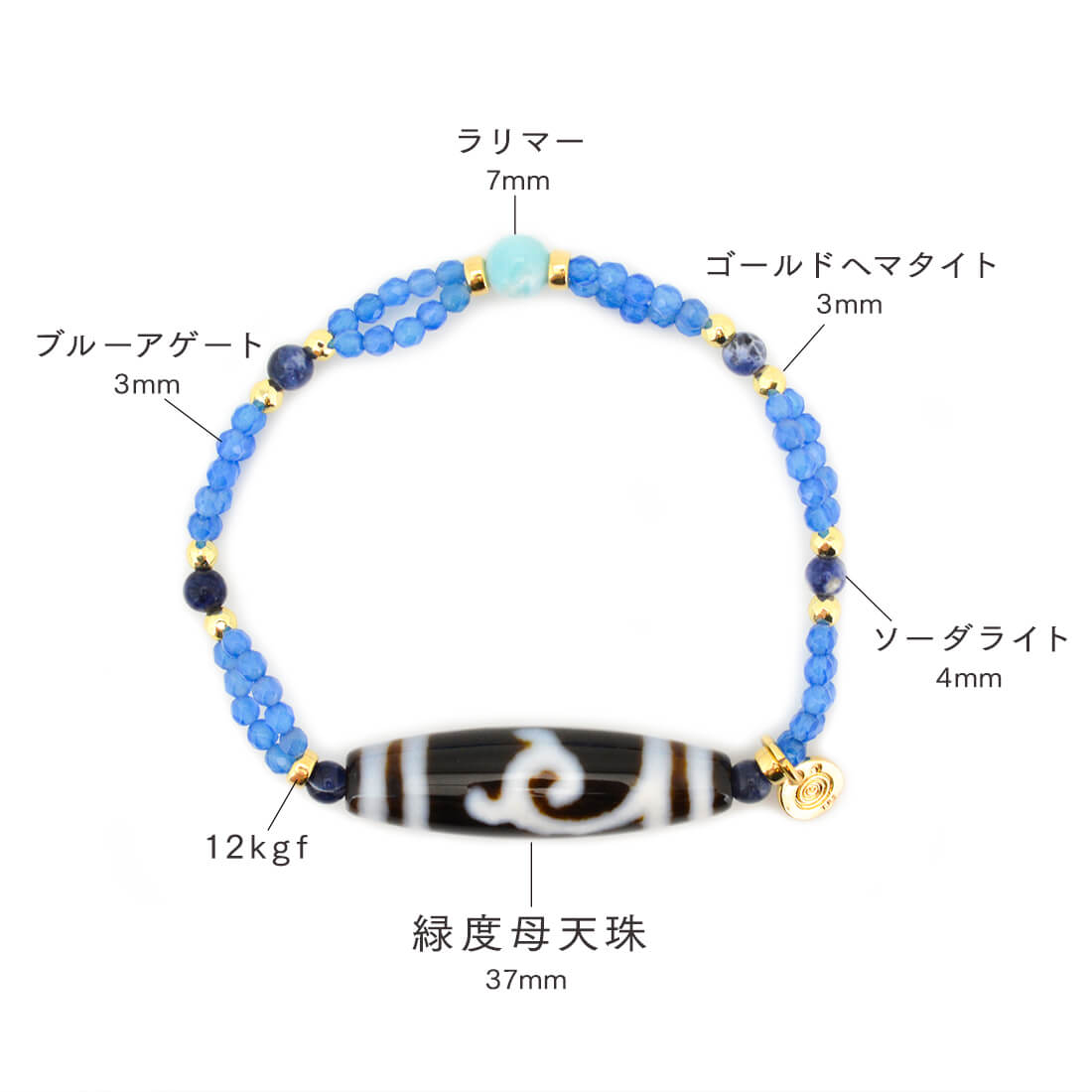 ラリマー+ブルーアゲート+ソーダライト+ゴールドヘマタイト+12KGF+オリジナルメダルチャーム