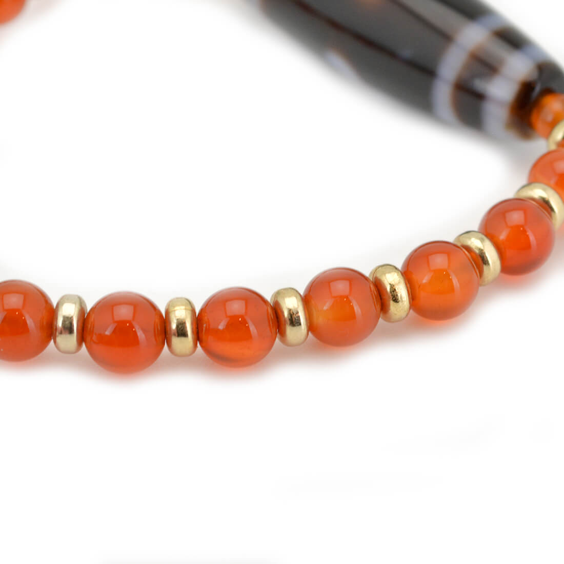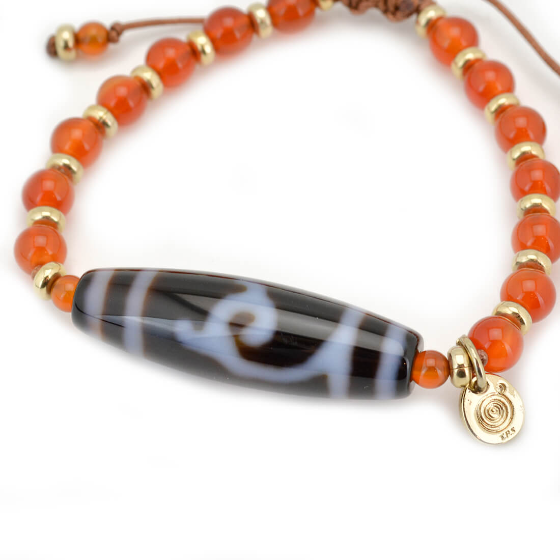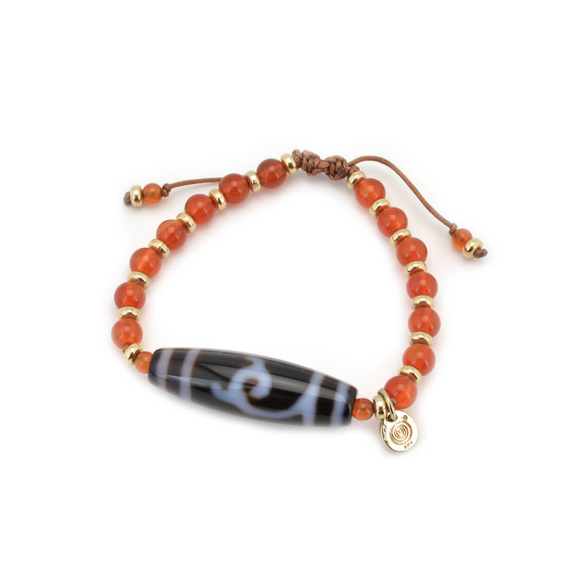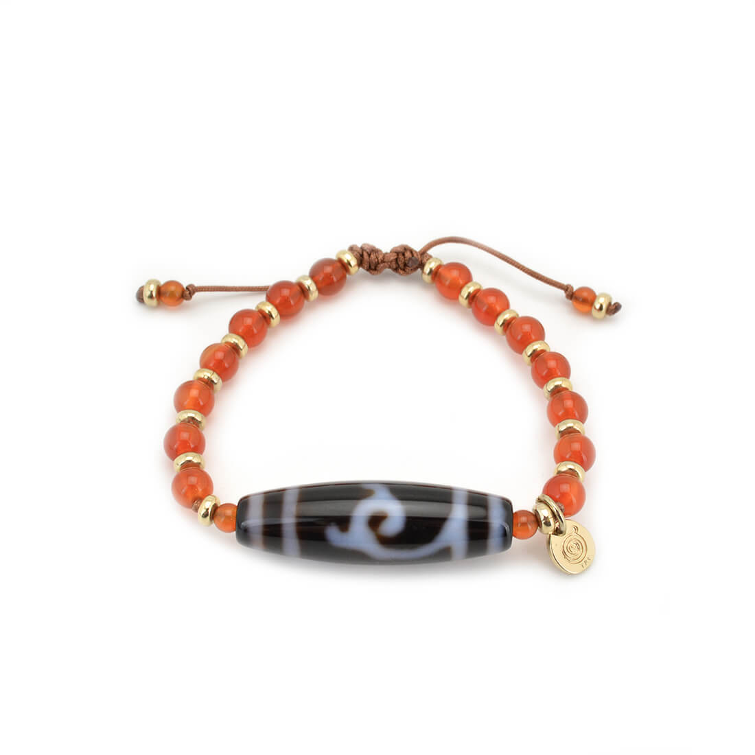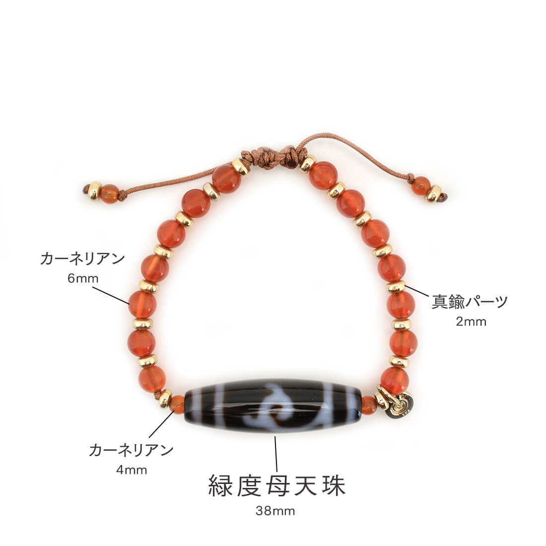 厄難を消除し運気を上げ、福を招き、願いをことごとく叶えてくれる稀少な天珠といわれている緑度母天珠に、力強さと勇気を与え、ビジネスの成功やエネルギーを高めるとされるカーネリアンなどを組み合わせたブレスレットです。
