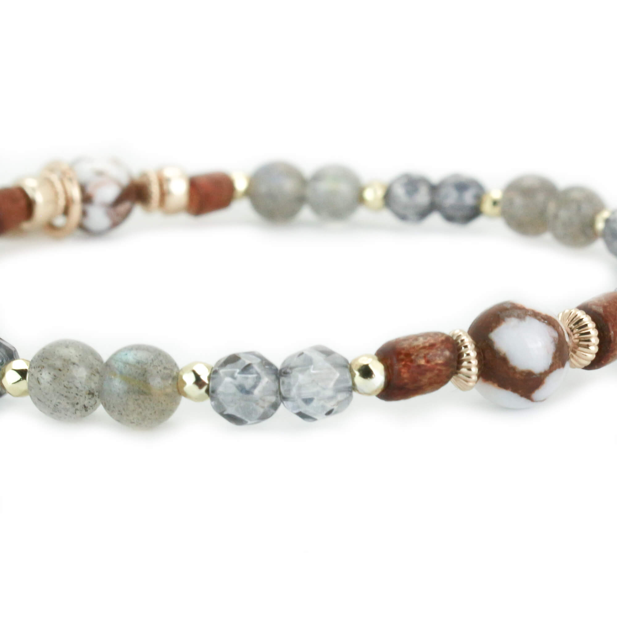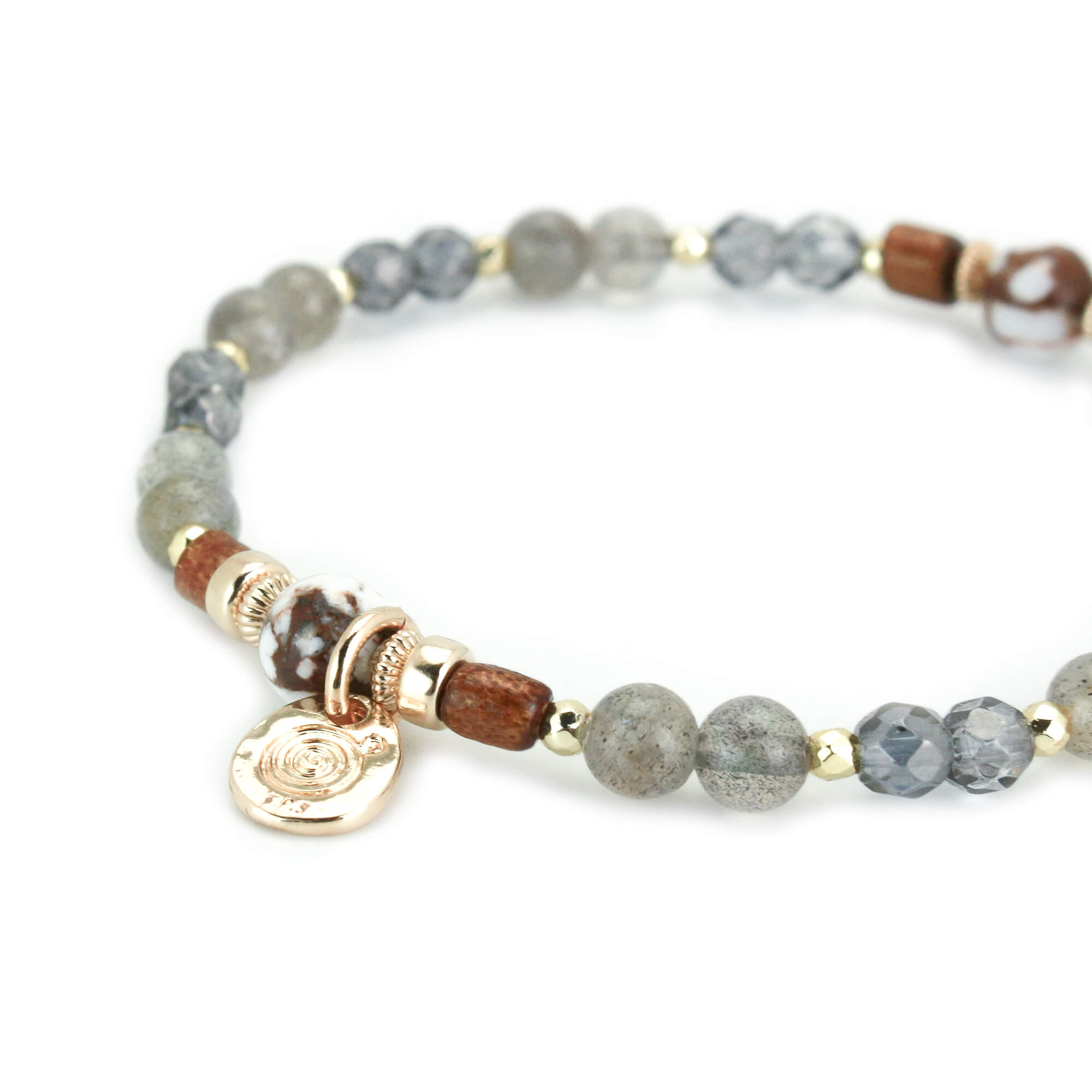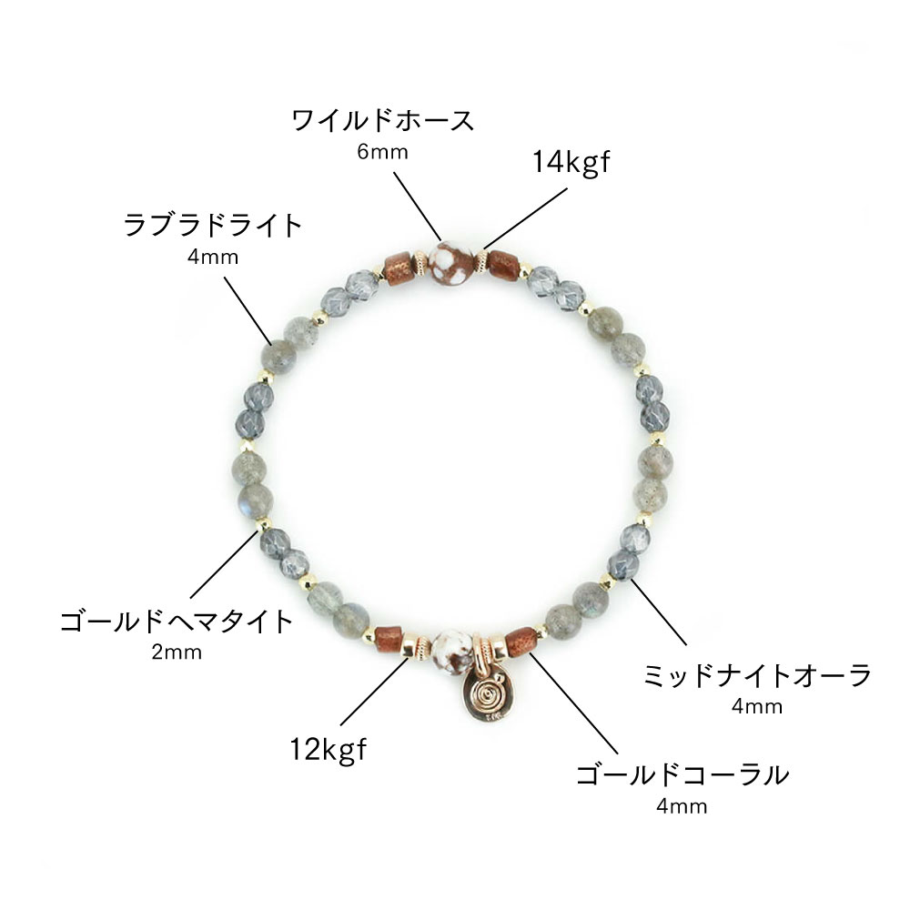 褐色と白色の模様が特徴で、幸運を引き寄せ奇跡を起こし、災いから守るといわれているワイルドホース、自身の成長を促し、自信を与えてくれるといわれるミッドナイトオーラ、月と太陽の象徴。活力・潜在能力の開花を表し、直観力・洞察力を高めるとされるラブラドライトなどを組み合わせたブレスレットです。