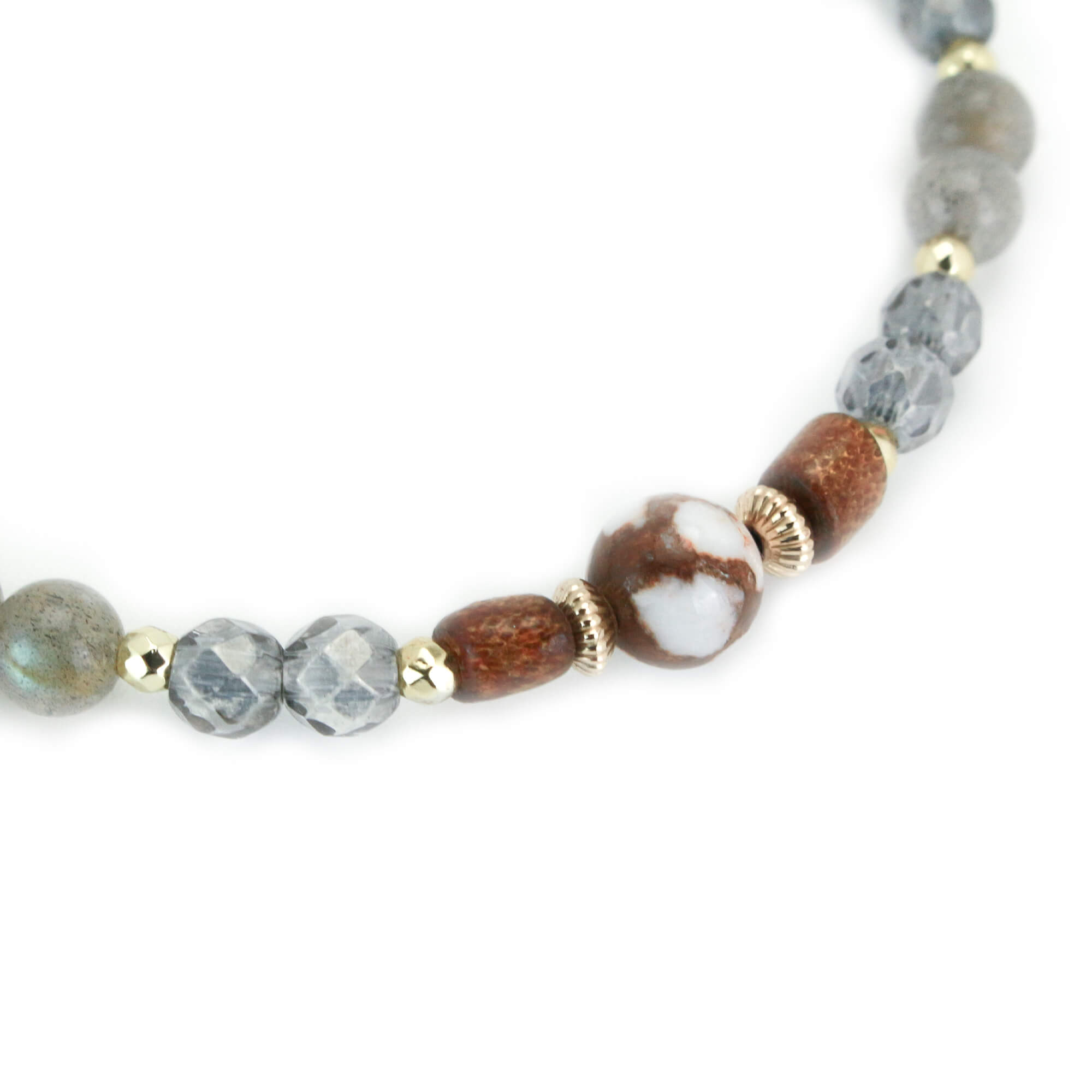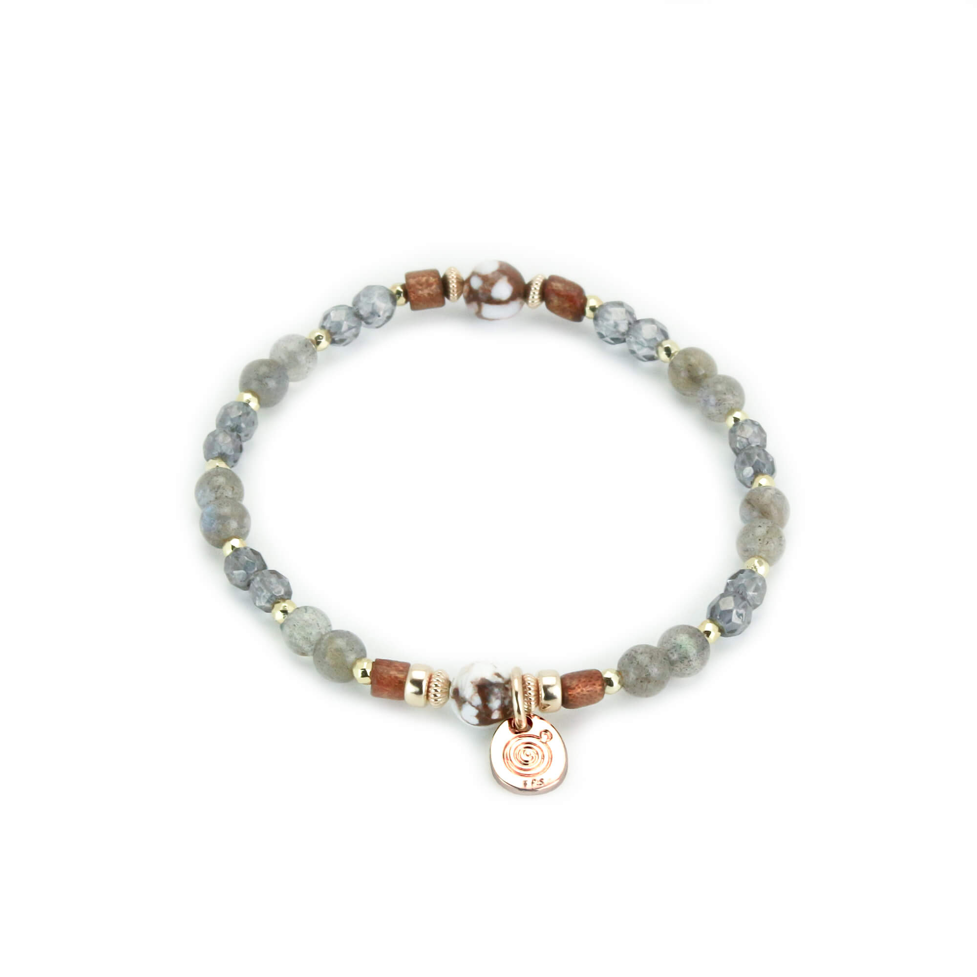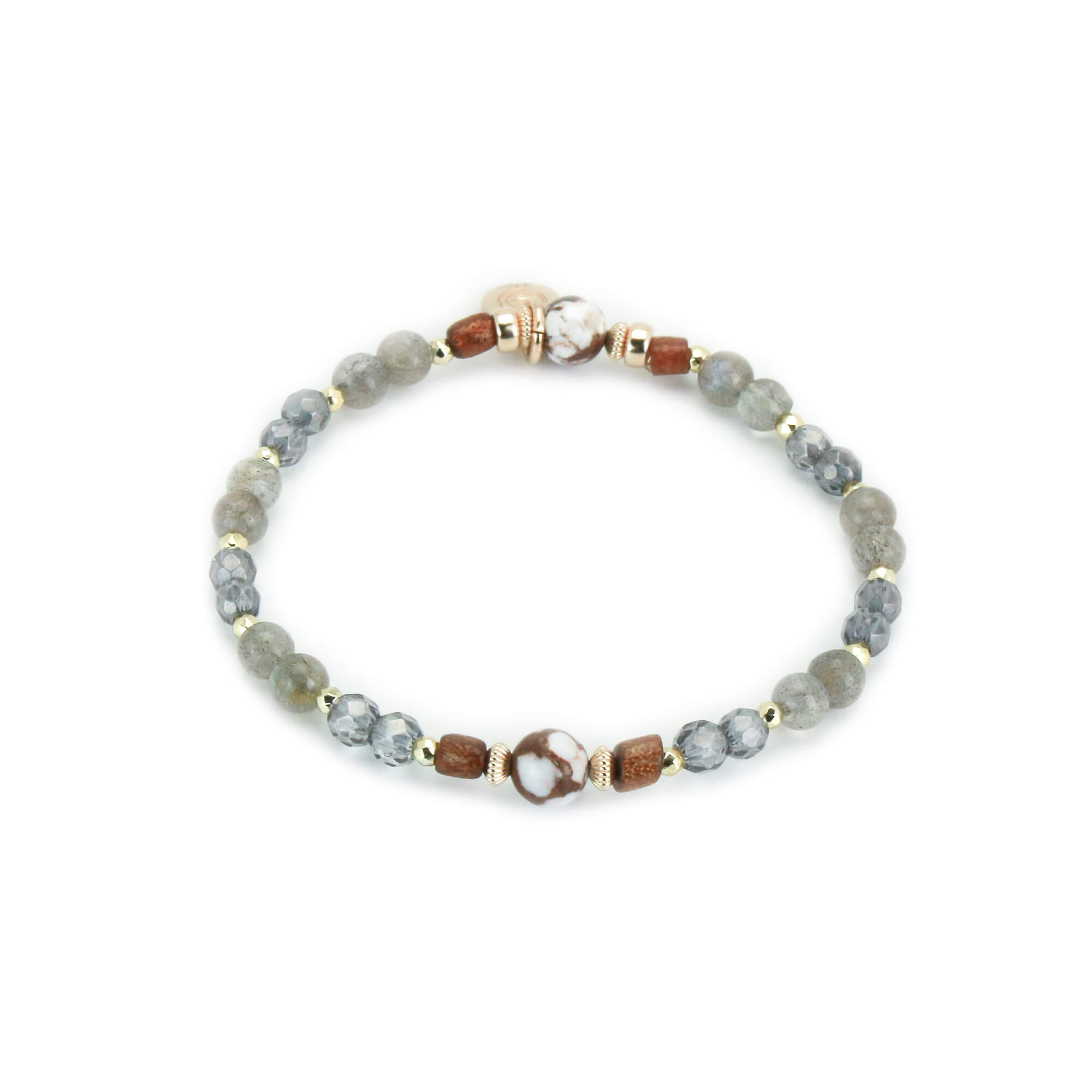 褐色と白色の模様が特徴で、幸運を引き寄せ奇跡を起こし、災いから守るといわれているワイルドホース、自身の成長を促し、自信を与えてくれるといわれるミッドナイトオーラ、月と太陽の象徴。活力・潜在能力の開花を表し、直観力・洞察力を高めるとされるラブラドライトなどを組み合わせたブレスレットです。