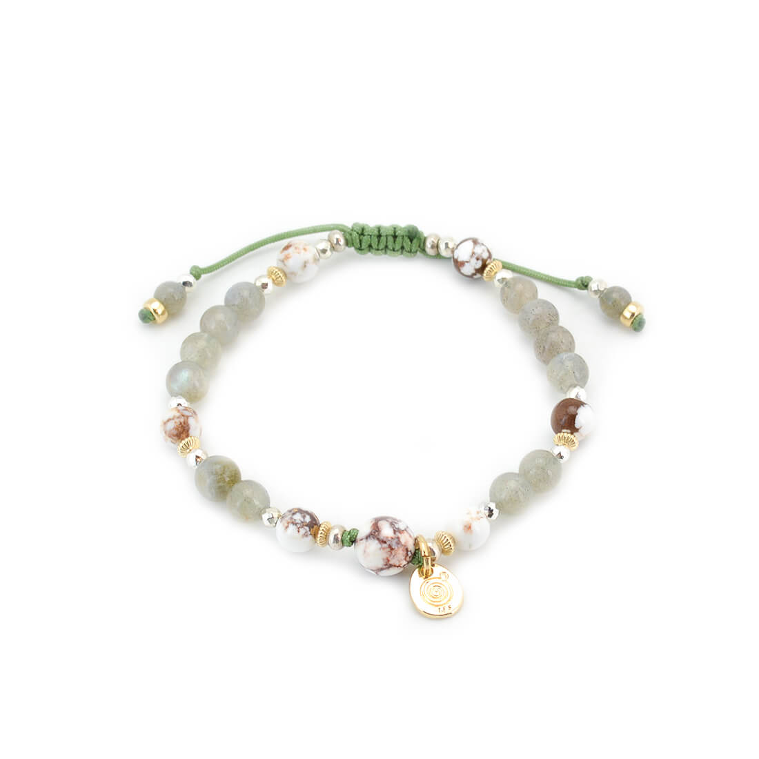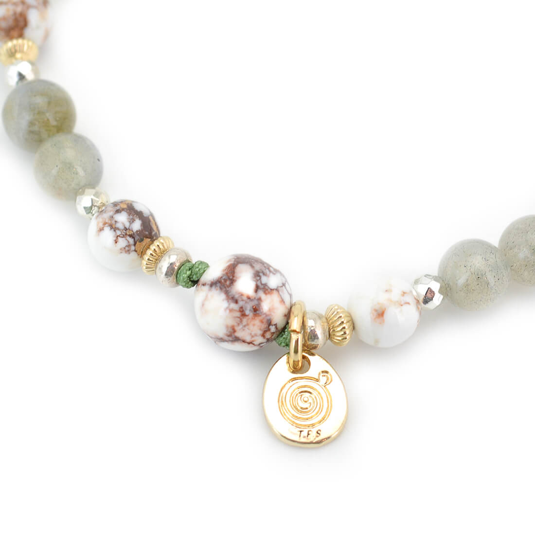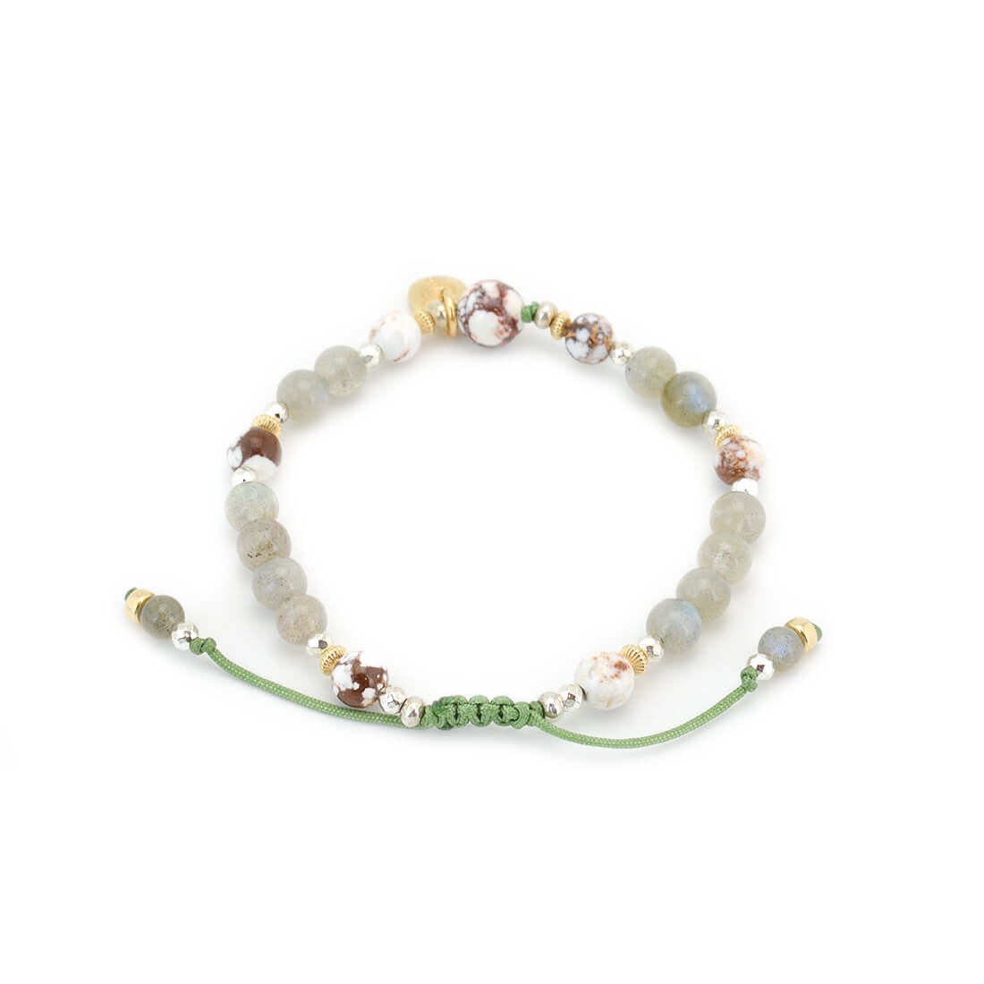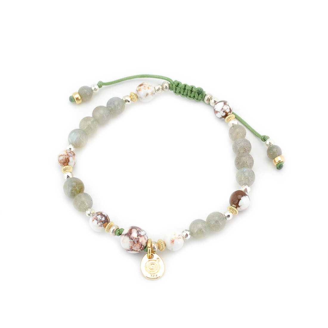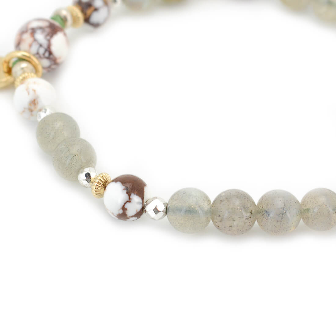 褐色と白色の模様が特徴で、幸運を引き寄せ奇跡を起こし、災いから守るといわれているワイルドホース、月と太陽の象徴。活力・潜在能力の開花を表し、直観力・洞察力を高めるとされるラブラドライトなどを組み合わせたブレスレットです。