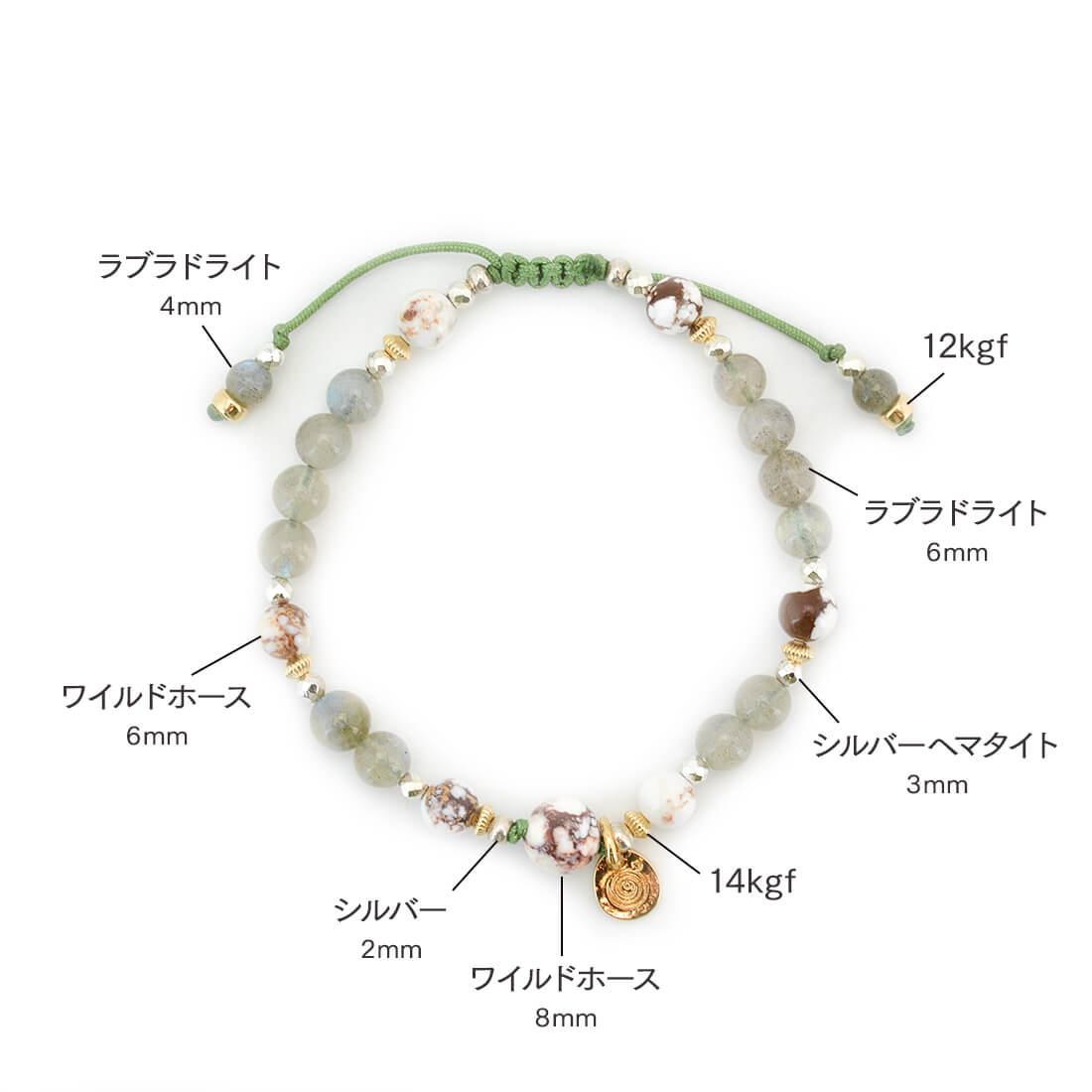 シルバー+ワイルドホース+シルバーヘマタイト+ラブラドライト+12KGF+14KGF+オリジナルメダルチャーム