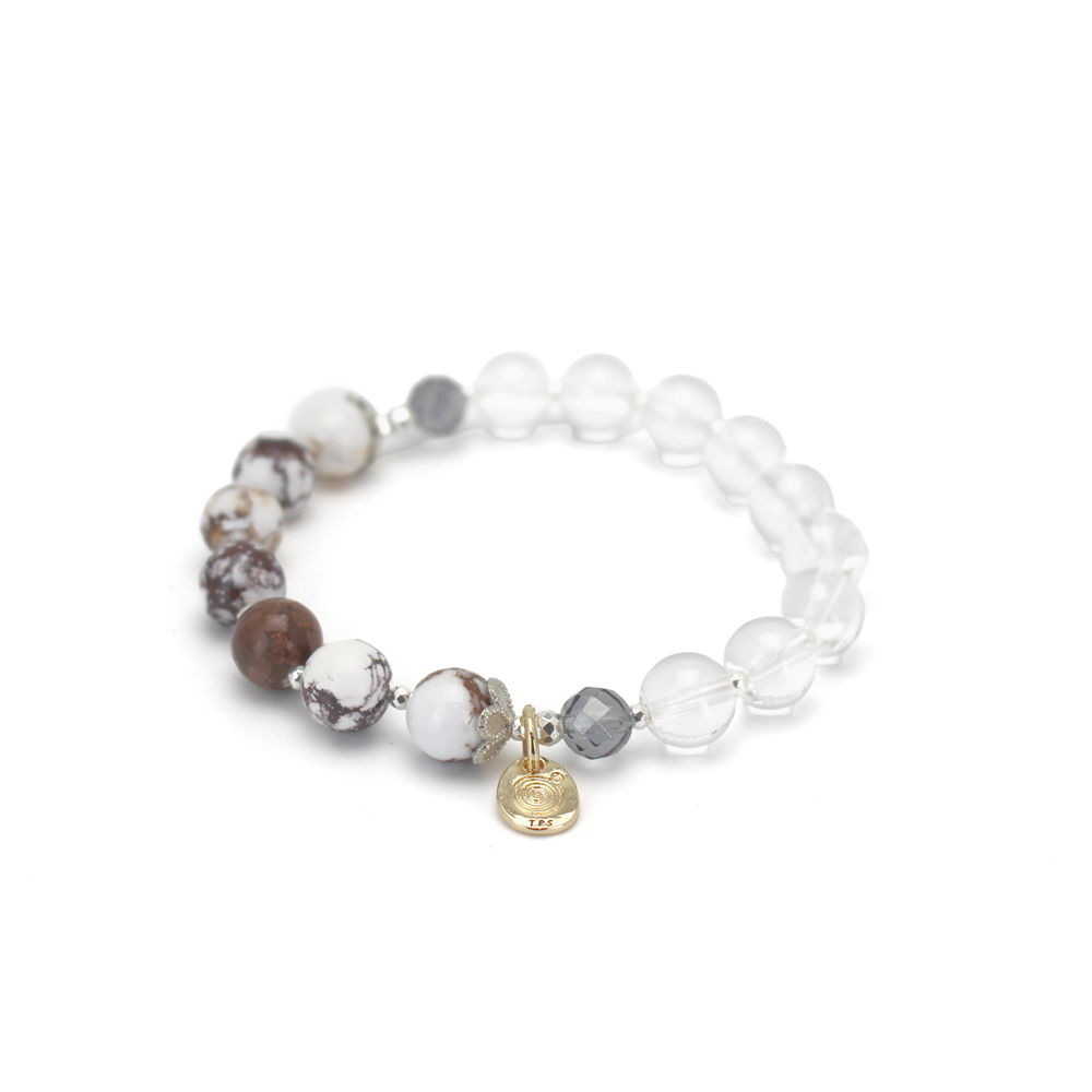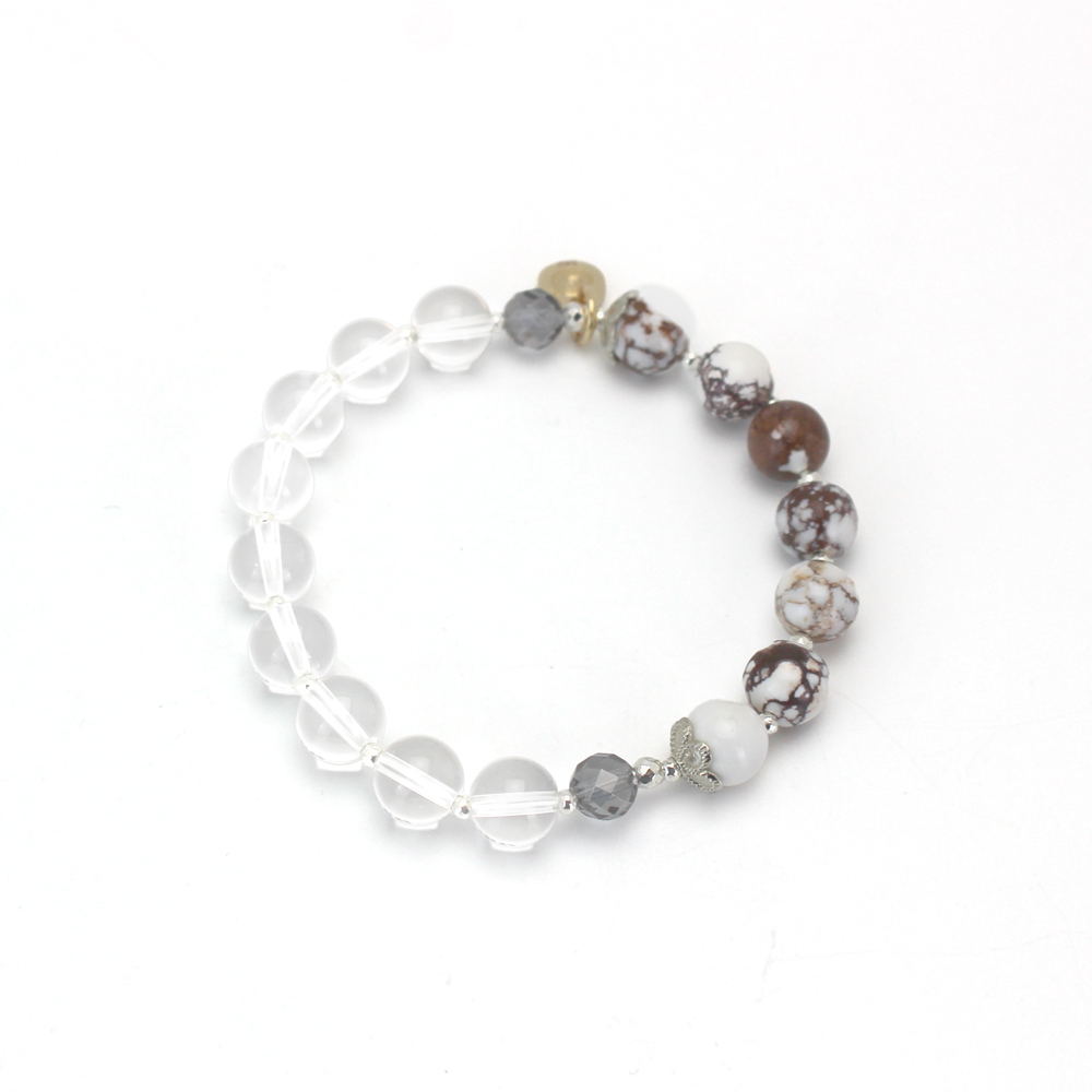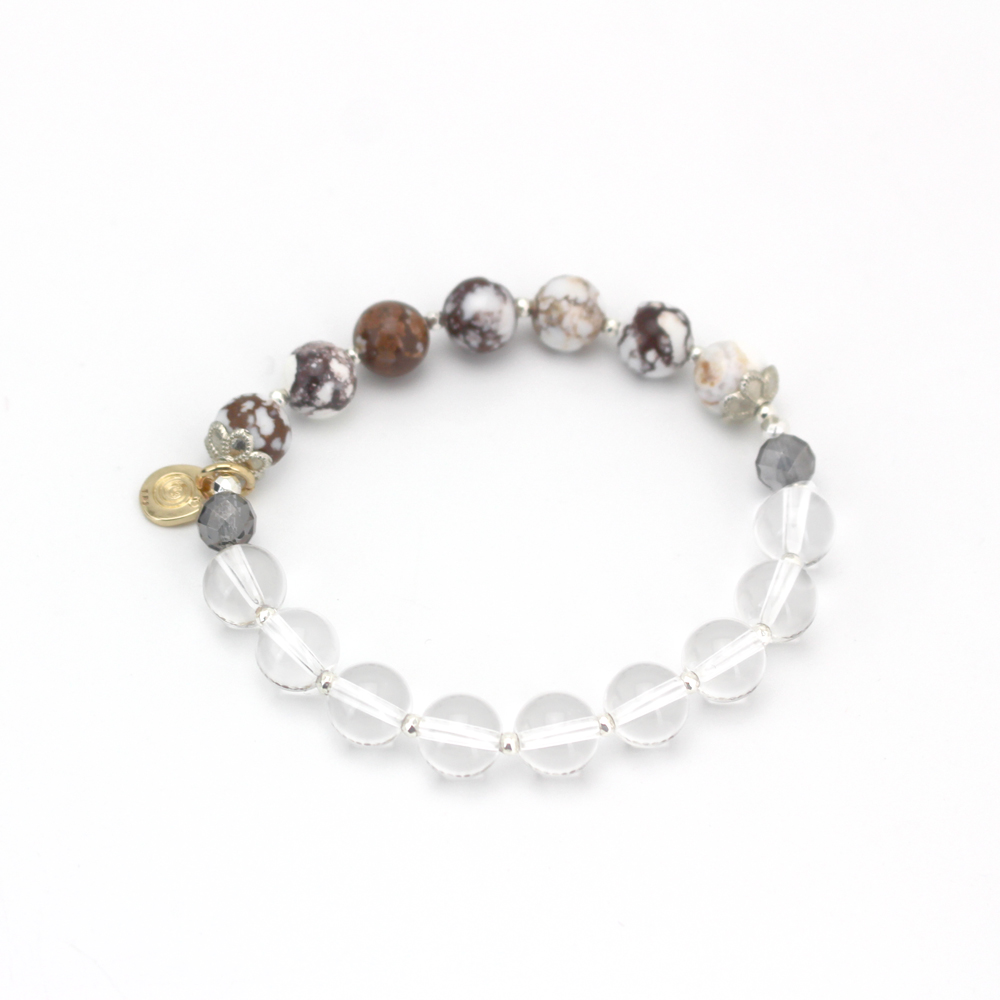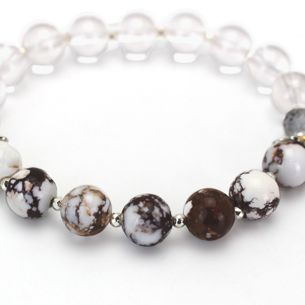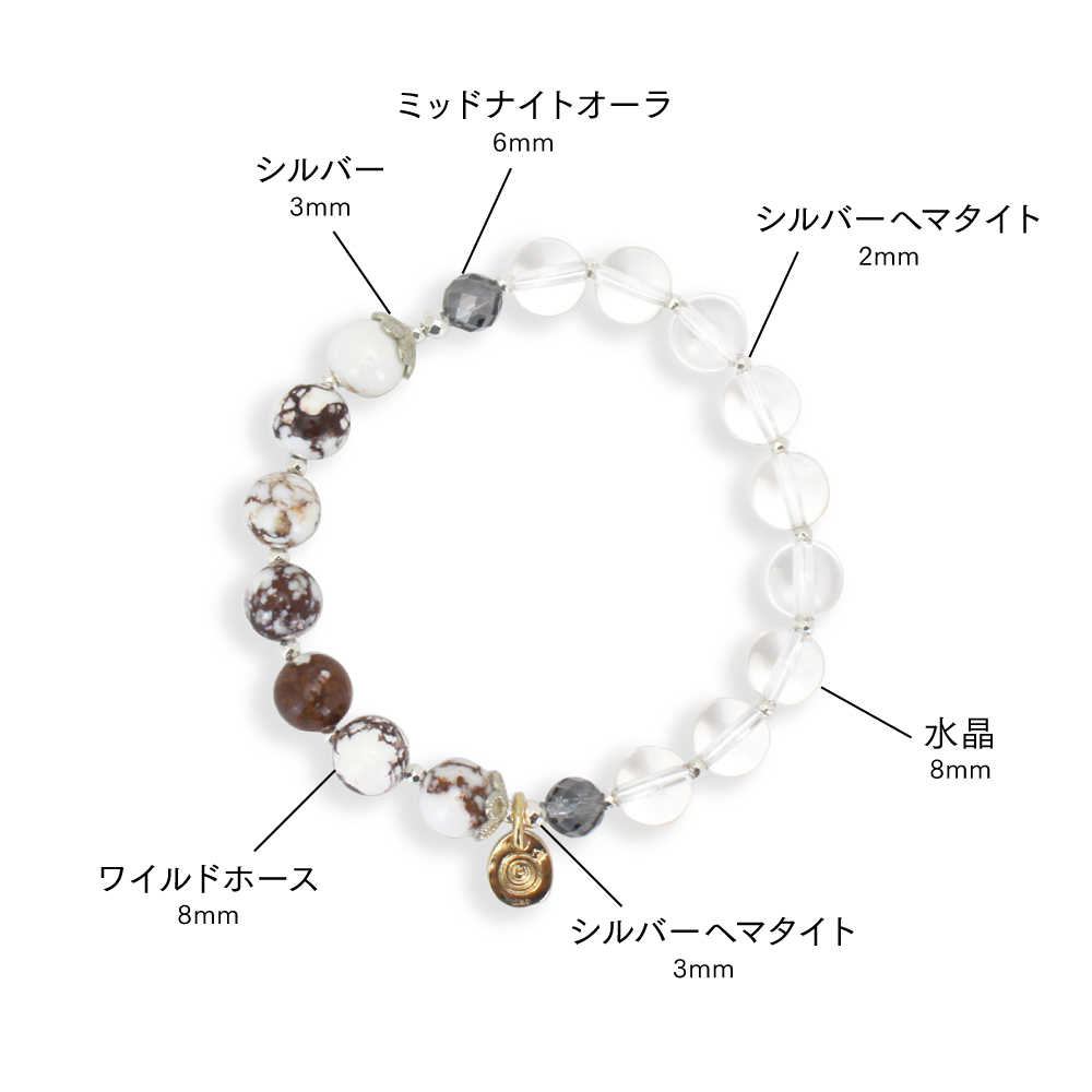 褐色と白色の模様が特徴で、幸運を引き寄せ奇跡を起こし、災いから守るといわれているワイルドホース、潜在能力を活性化させ、魔除けの作用を持つ万能パワーストーンとされる水晶、自身の成長を促し、自信を与えてくれるといわれるミッドナイトオーラなどを組み合わせたブレスレットです。