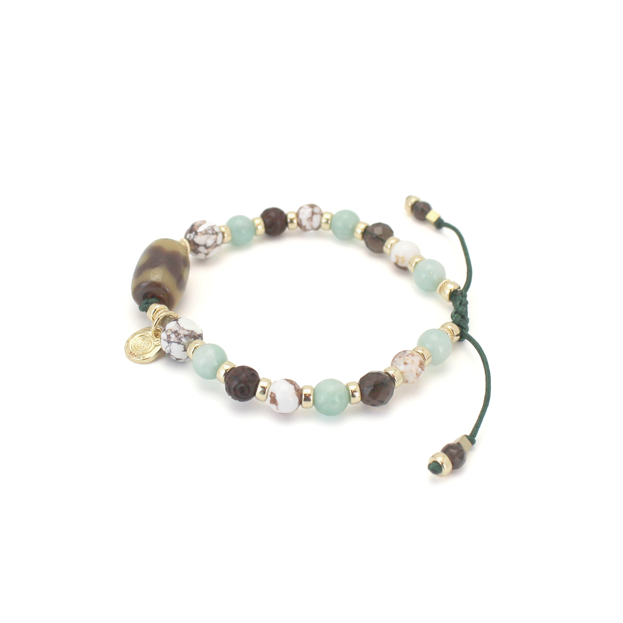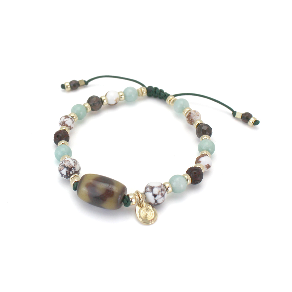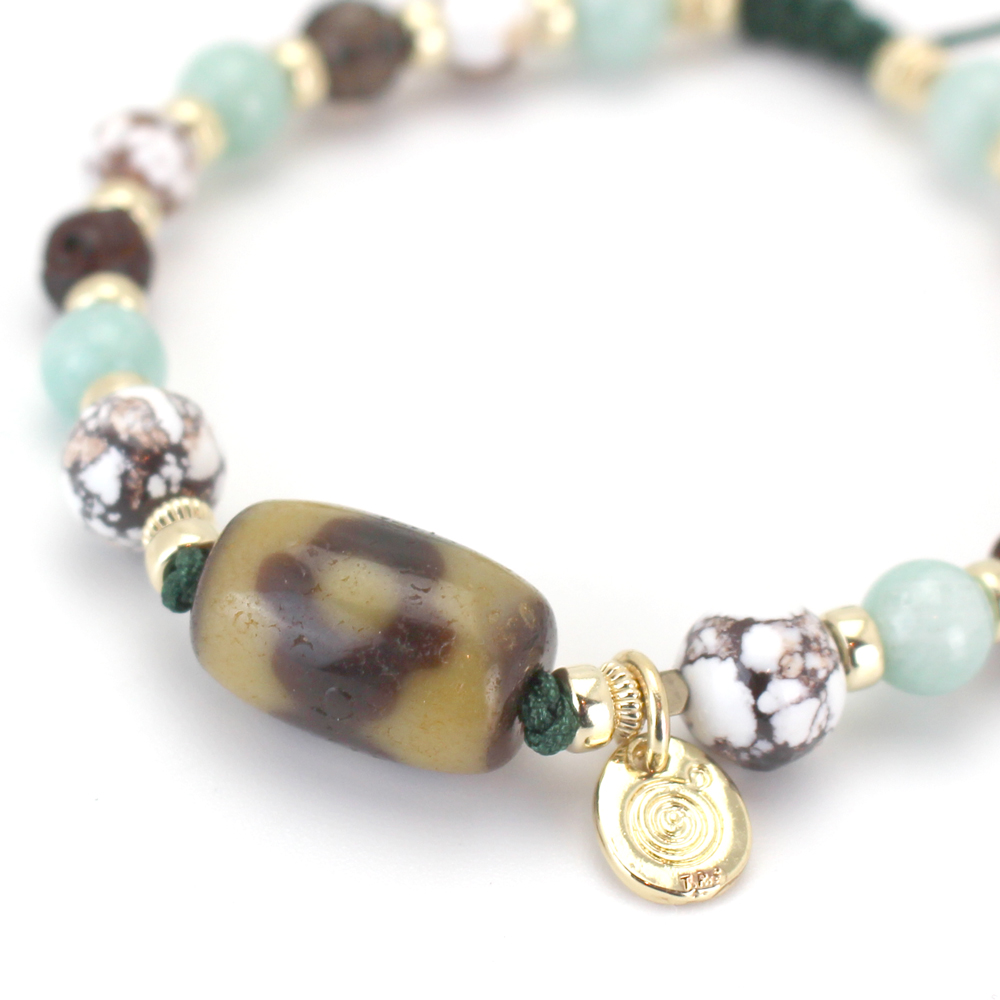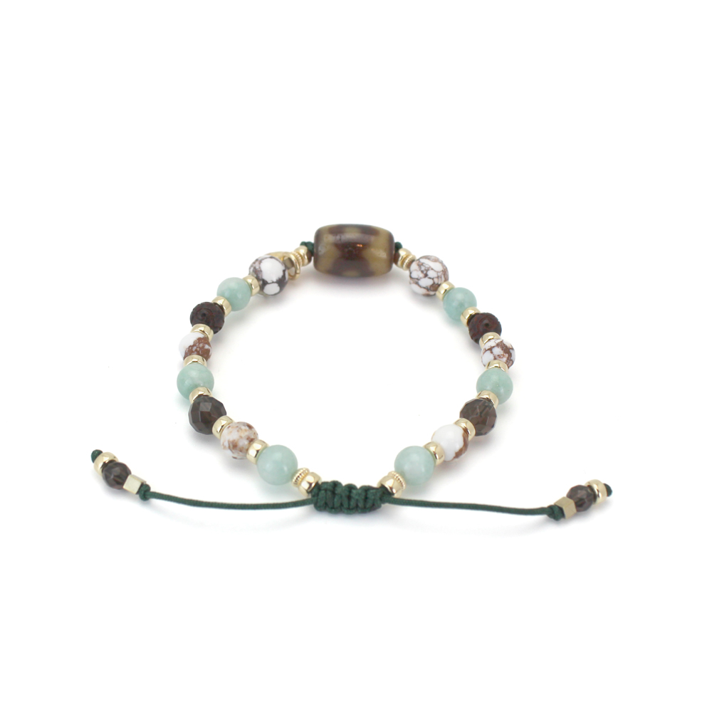 良い人間関係を築き助力してくれる人を呼び寄せ、財を成すといわれている馬牙三眼天珠に、褐色と白色の模様が特徴で、幸運を引き寄せ奇跡を起こし、災いから守るといわれているワイルドホースなどを組み合わせたブレスレットです。