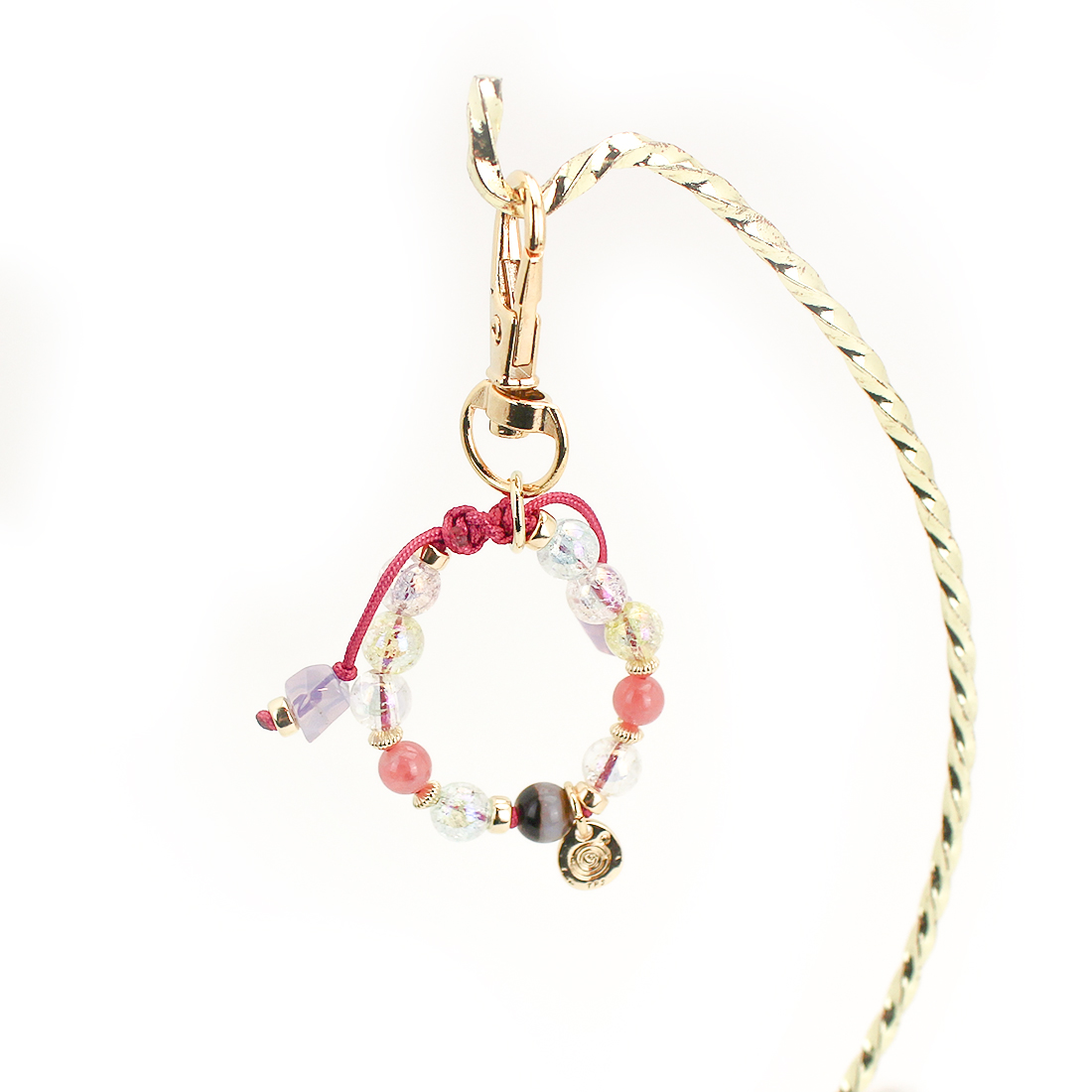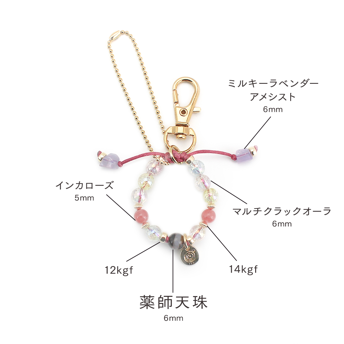 薬師如来のご加護を得られるとされ、身体は丈夫で元気になり、百病消滅・長壽の御利益があるといわれている薬師天珠に、傷ついた過去を払拭させるといわれているインカローズ、恋愛成就、魅力・才能を引き出すとされるアメシストなどを組み合わせたストラップです。