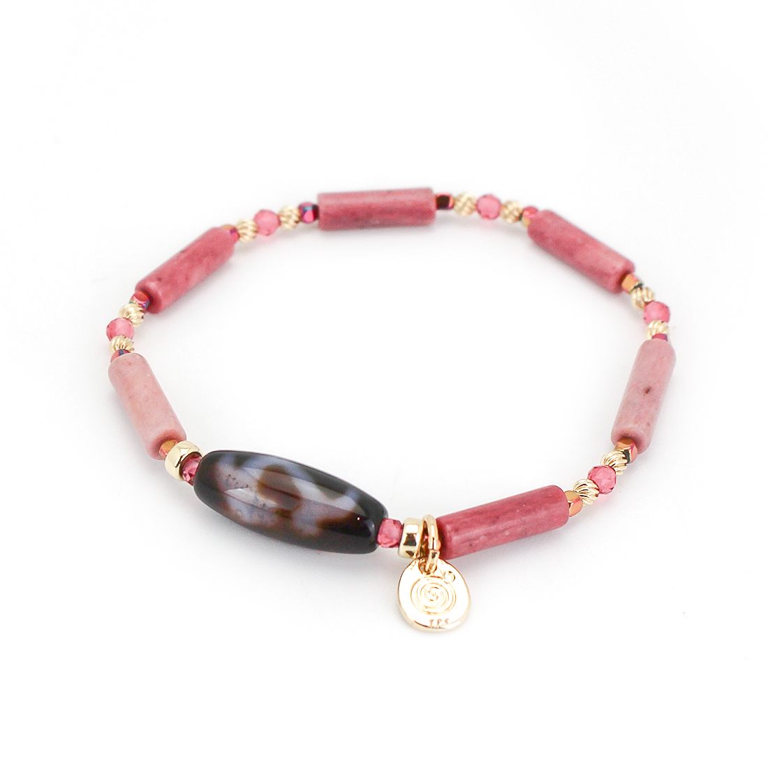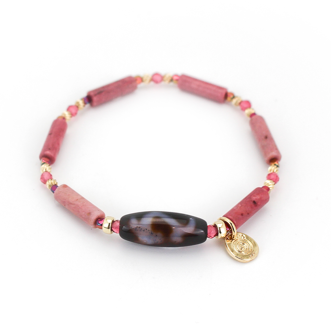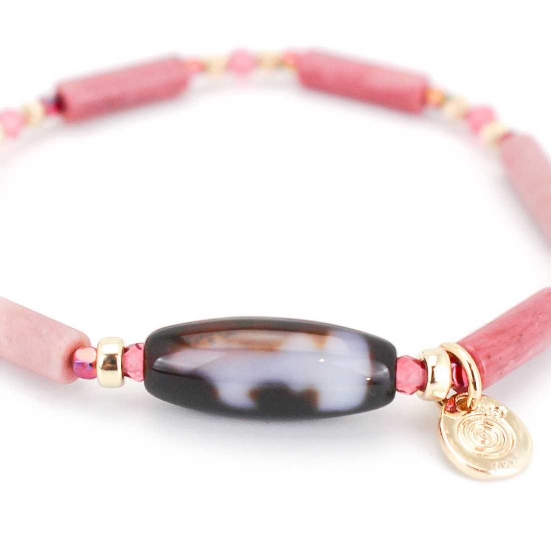 慈愛の象徴で、福財・男女和合・才能開花・積極性の向上により、意の如く事がうまく運ぶといわれている如意天珠と、精神安定・金運招来・病魔退散・平和・幸福に導くといわれている観音天珠のパワーを併せ持つ如意観音天珠に、ストレスを軽減させ、精神力や独創的な思考を高めるといわれるピーコックヘマタイト、物事の集中力を高め、目標達成できるようにサポートしてくれるといわれているピンクスピネルや生命力を高め、健康を保つとされるローズジャスパーなどを組み合わせたブレスレットです。