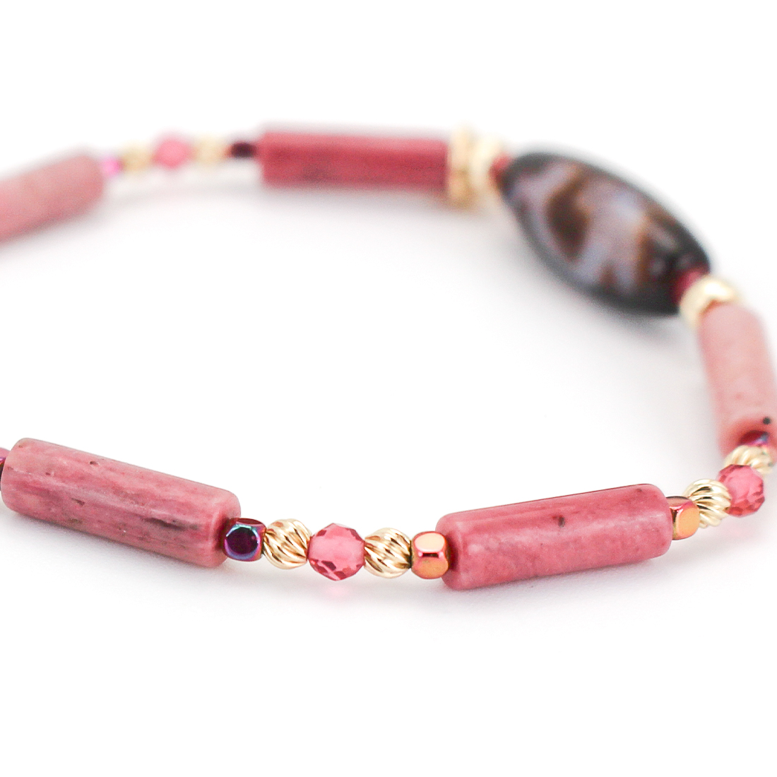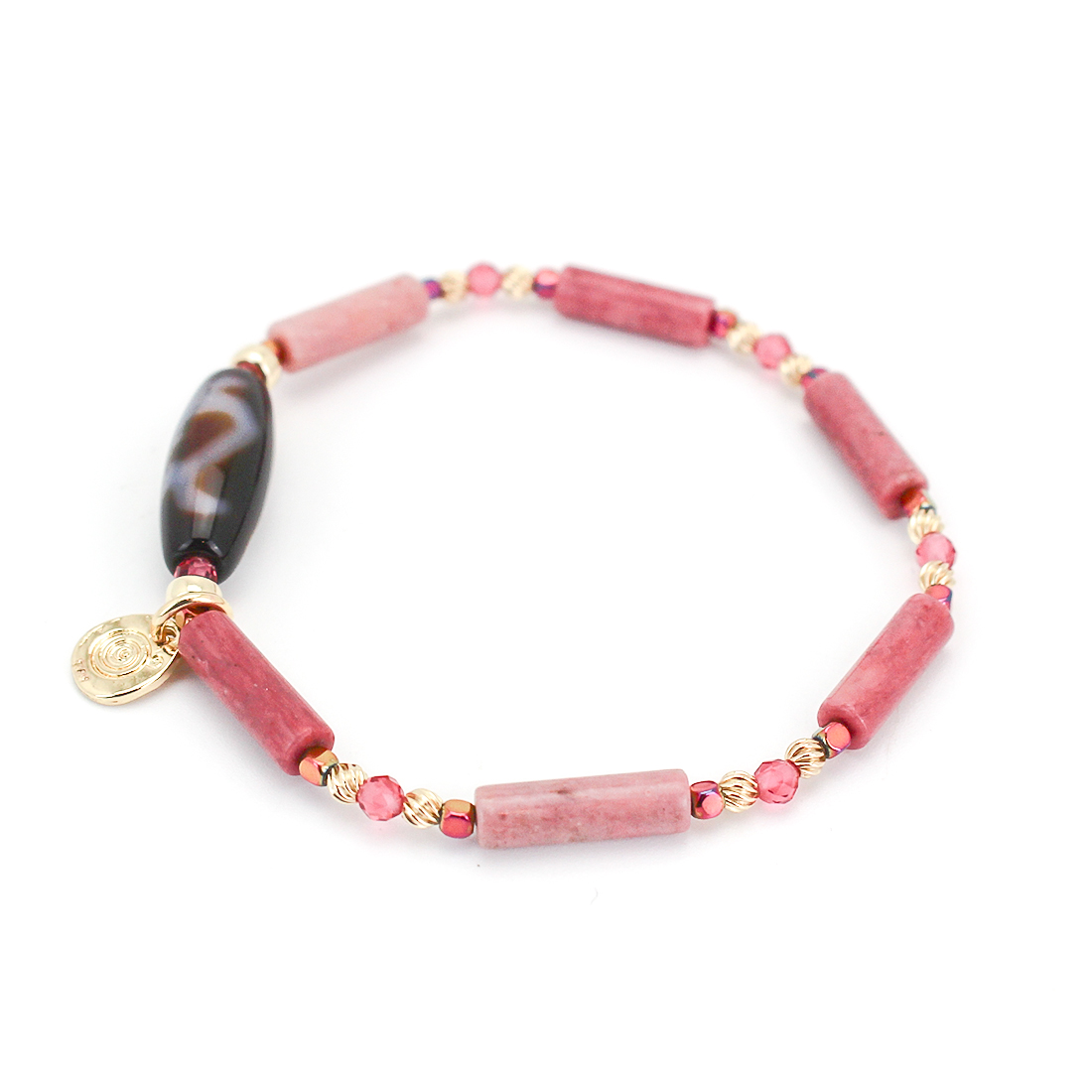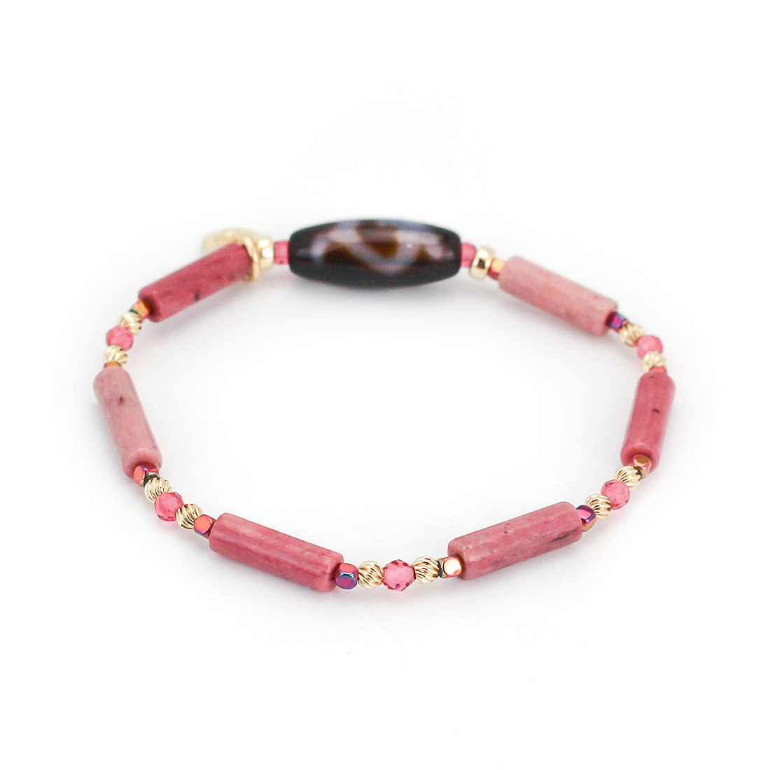 慈愛の象徴で、福財・男女和合・才能開花・積極性の向上により、意の如く事がうまく運ぶといわれている如意天珠と、精神安定・金運招来・病魔退散・平和・幸福に導くといわれている観音天珠のパワーを併せ持つ如意観音天珠に、ストレスを軽減させ、精神力や独創的な思考を高めるといわれるピーコックヘマタイト、物事の集中力を高め、目標達成できるようにサポートしてくれるといわれているピンクスピネルや生命力を高め、健康を保つとされるローズジャスパーなどを組み合わせたブレスレットです。