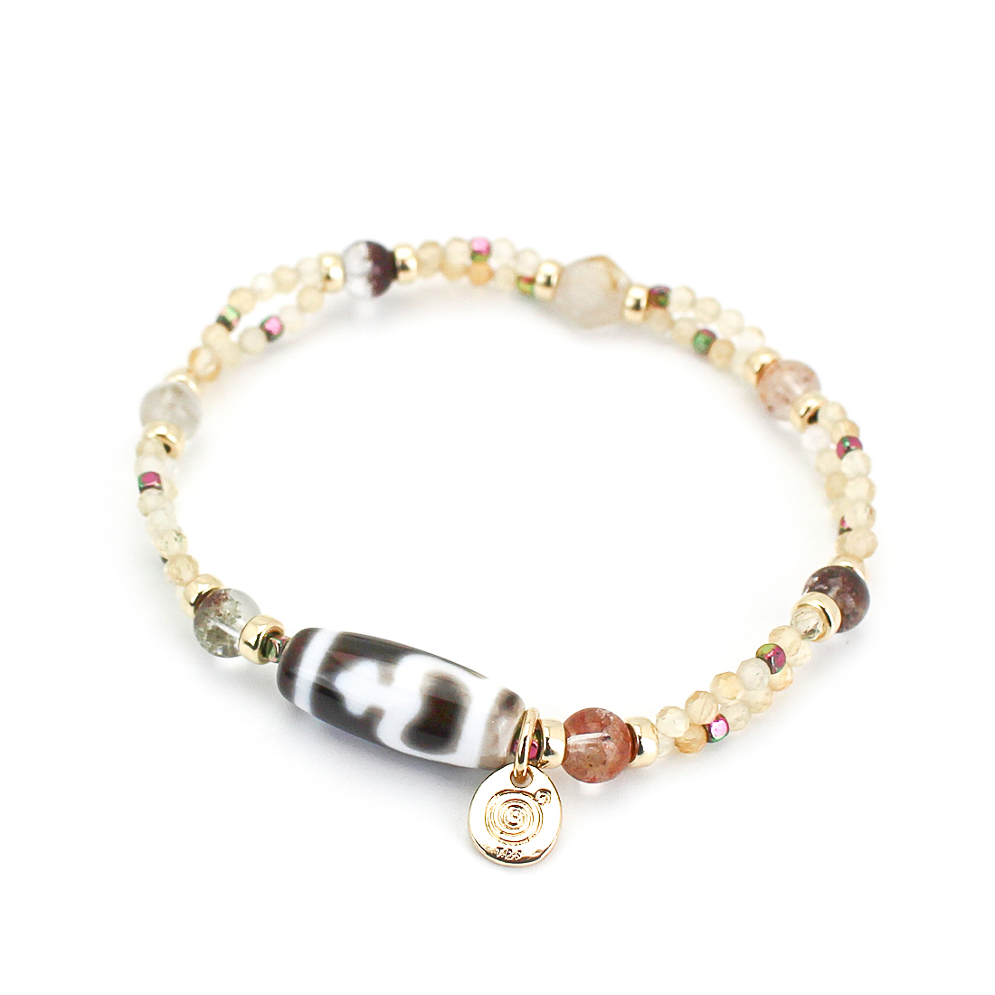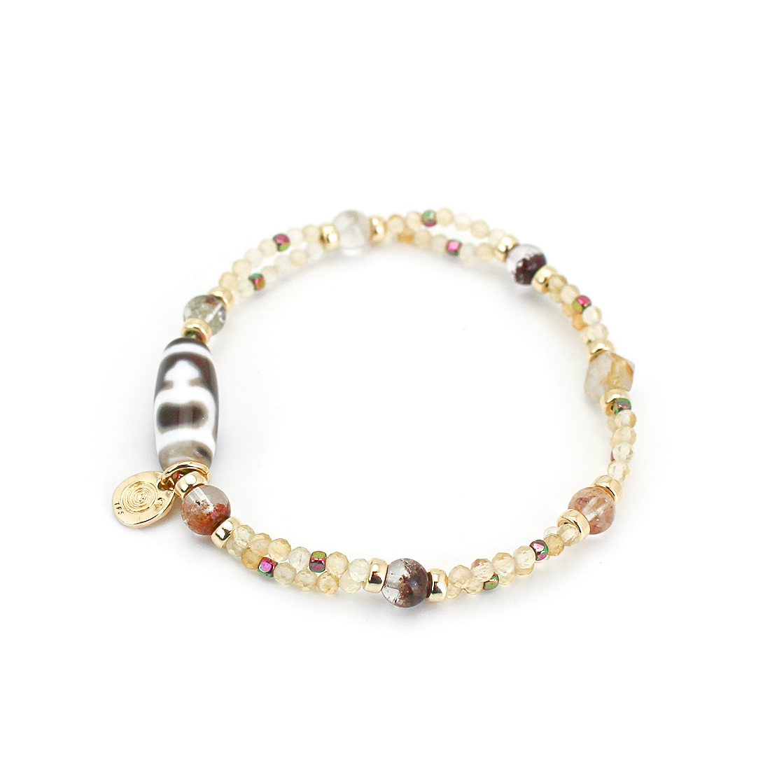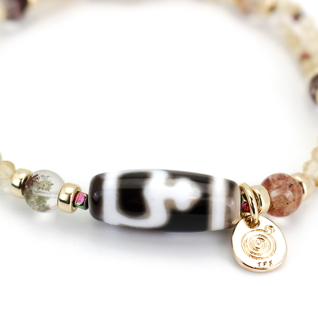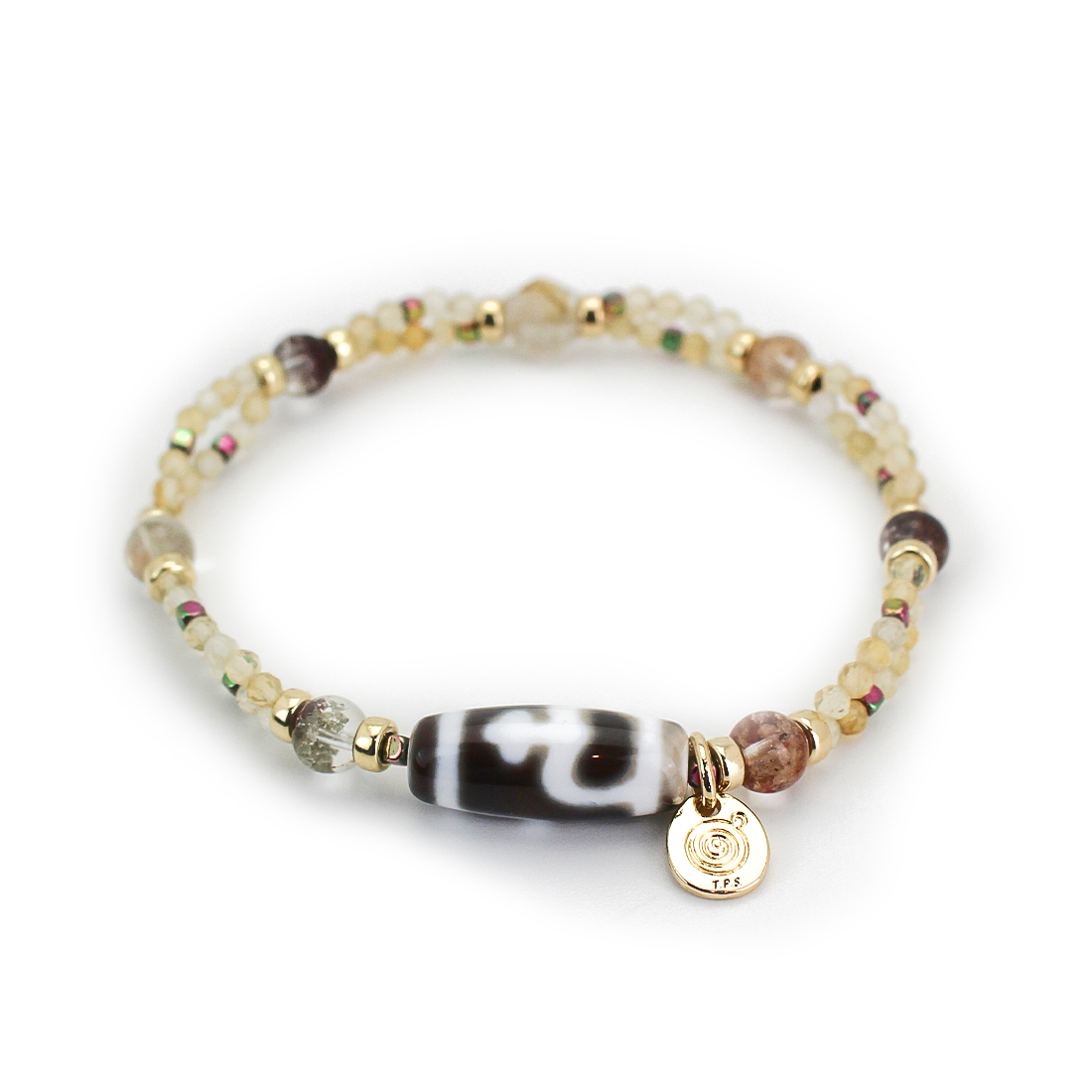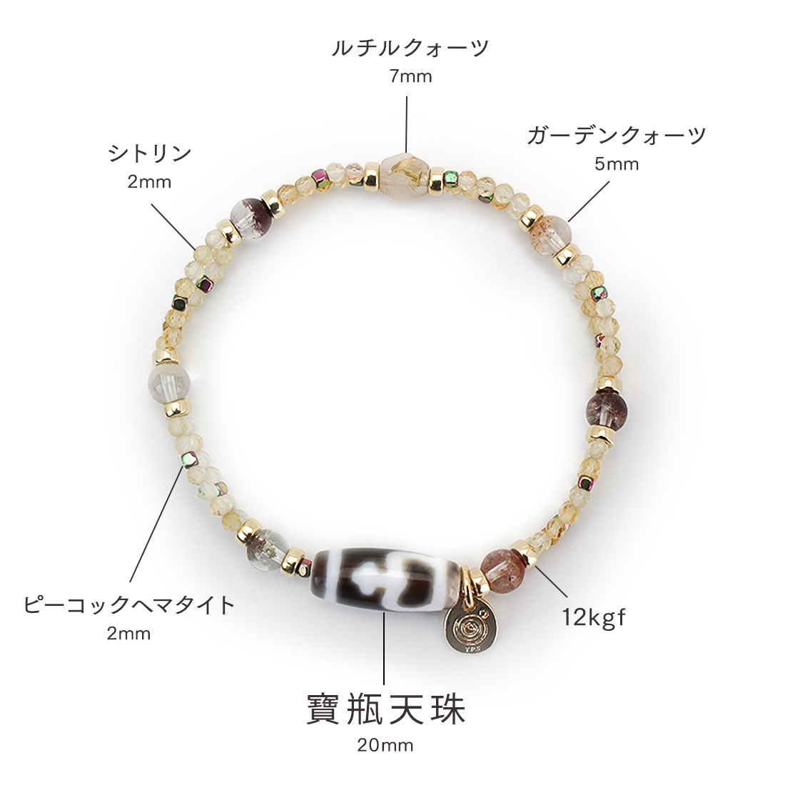 お金が貯まる入れ物を表す。大いなる金運を授かり、大財を築ける。子宝にも恵まれるといわれている寶瓶天珠に、疲れを癒し安らぎを与えるとされ、表現力をアップさせるといわれているガーデンクォーツ、太陽を象徴する石とされ、商売繁盛・事業成功・金運・財運・貯蓄運アップによいといわれているシトリン、ストレスを軽減させ、精神力や独創的な思考を高めるといわれるピーコックヘマタイトや、天使の髪、愛の矢を象徴する石とされ、金運・仕事運アップを強力に高めるといわれるルチルクォーツなどを組み合わせたブレスレットです。