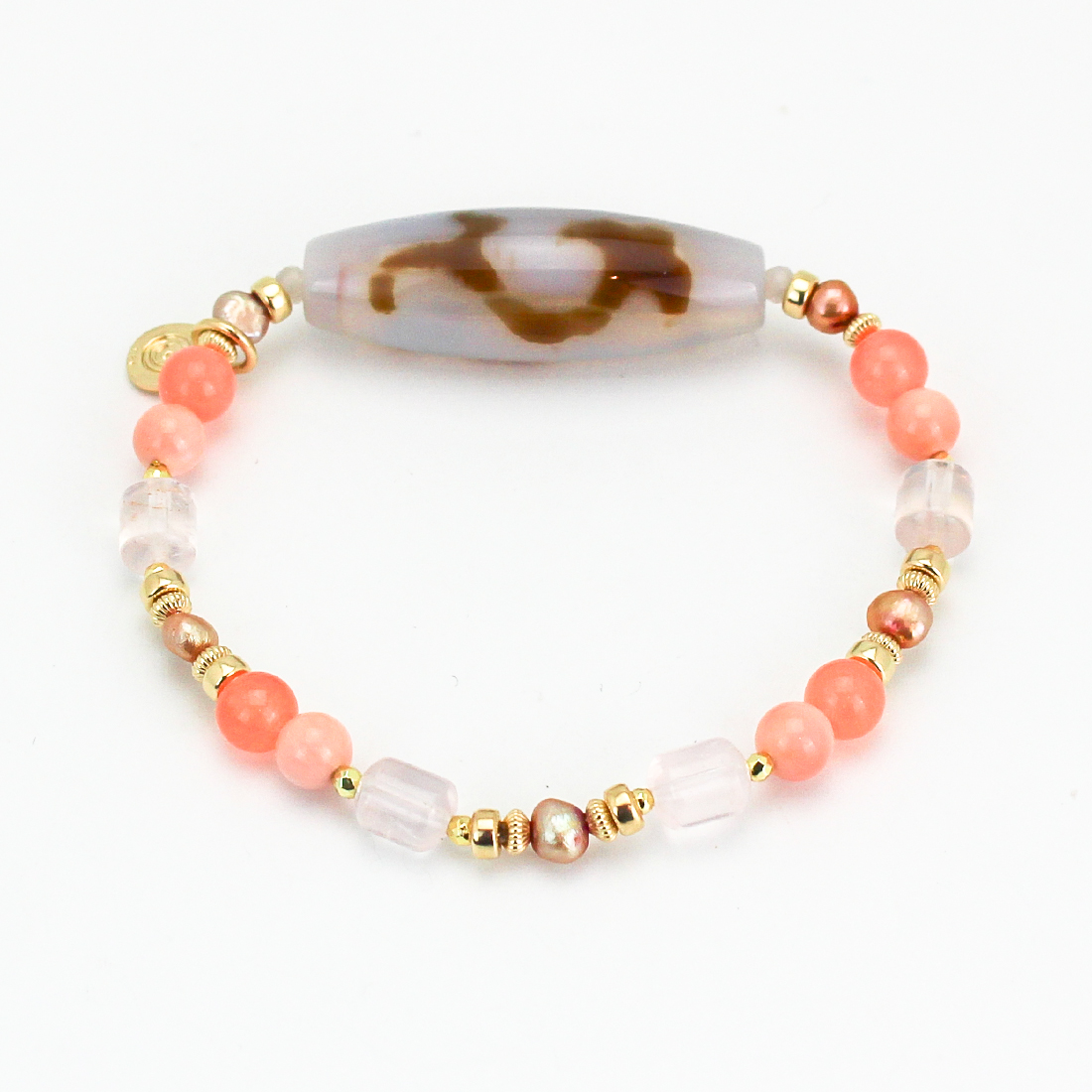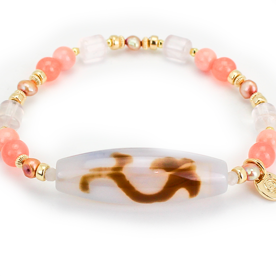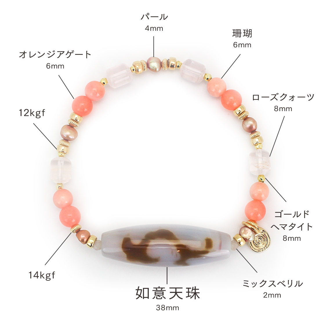 慈愛の象徴で、福財・男女和合・才能開花・積極性の向上により、意の如く事がうまく運ぶといわれている如意天珠に、恋愛成就・子宝・安産のお守りとされ、魔除けにもよいといわれている珊瑚や、愛の成就・若返りなど、愛と癒しの象徴。美的感覚向上、心身安定によいといわれているローズクォーツ、美の象徴とされ、女性のステータスを上げるといわれているパールなどを組み合わせたブレスレットです。