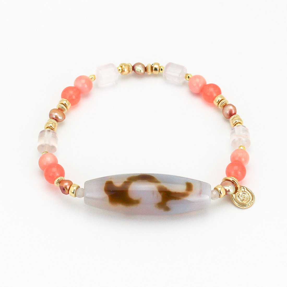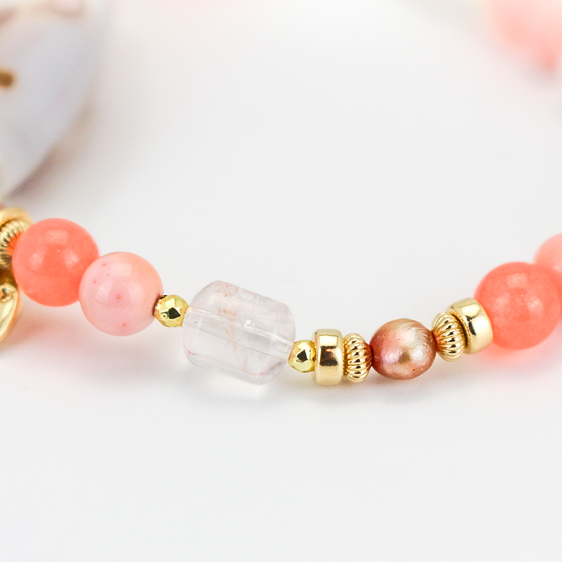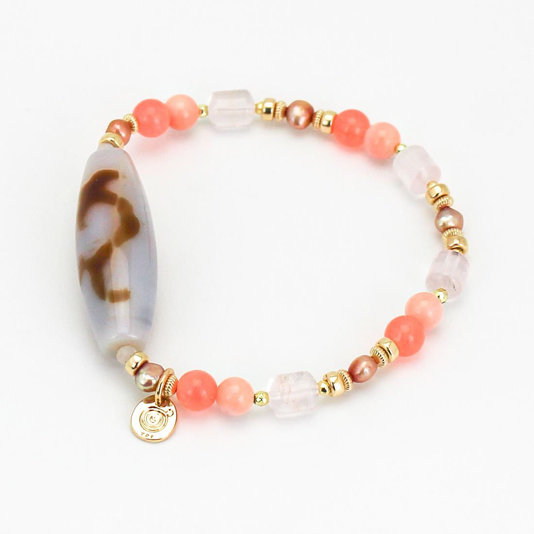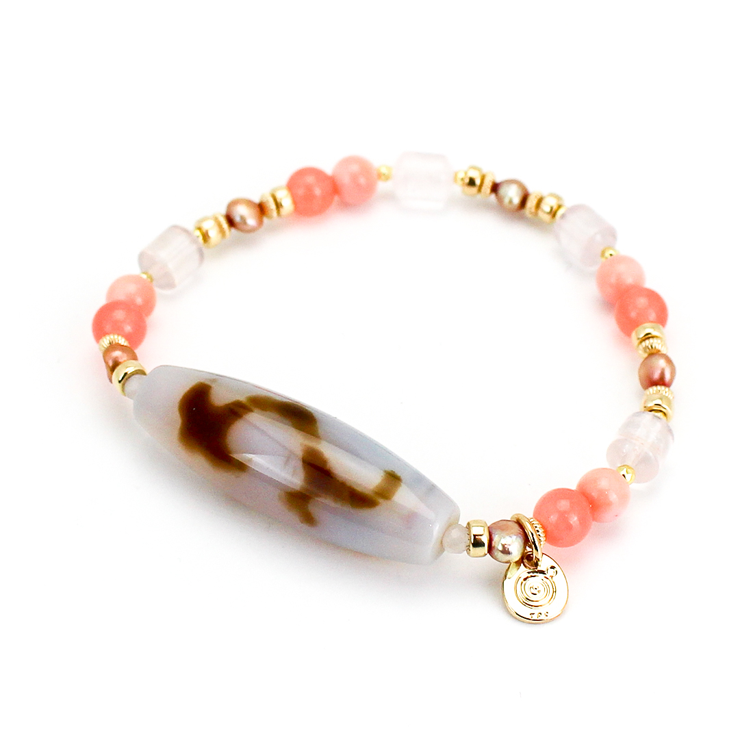 慈愛の象徴で、福財・男女和合・才能開花・積極性の向上により、意の如く事がうまく運ぶといわれている如意天珠に、恋愛成就・子宝・安産のお守りとされ、魔除けにもよいといわれている珊瑚や、愛の成就・若返りなど、愛と癒しの象徴。美的感覚向上、心身安定によいといわれているローズクォーツ、美の象徴とされ、女性のステータスを上げるといわれているパールなどを組み合わせたブレスレットです。