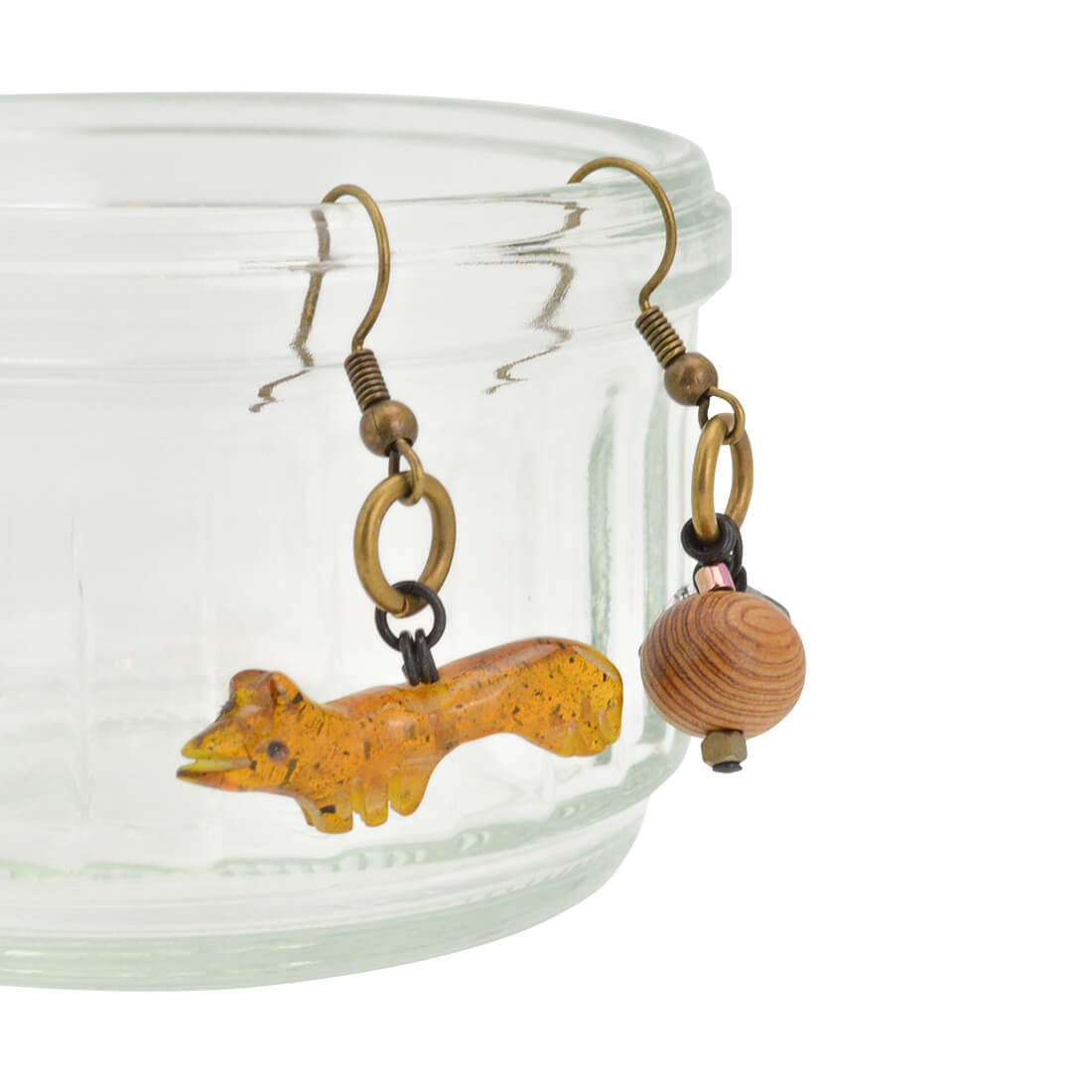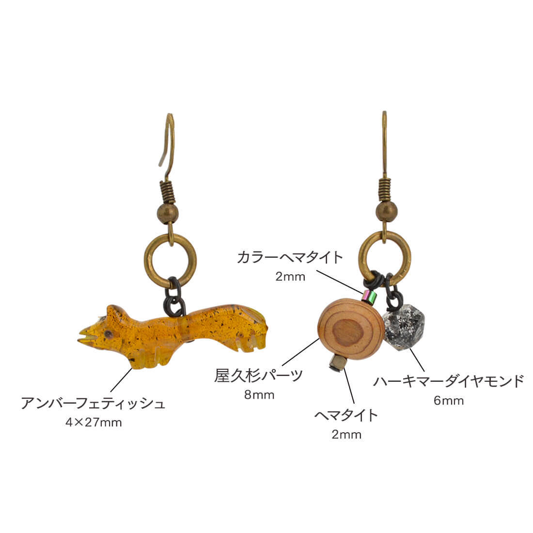財産運の安定、邪気払いに良いとされるアンバーや、鮮明な夢を見て幸運に導かれ、意識の拡大・心身のバランスを強化するといわれているハーキマーダイヤモンド、目標を達成し、勝利へ導く石とされるヘマタイトなどを組み合わせたピアスです。