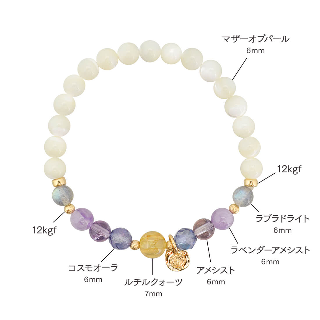天使の髪、愛の矢を象徴する石とされ、金運・仕事運アップを強力に高めるといわれるルチルクォーツや、子宝や繁栄の象徴として、女性の魅力を高める石とされるマザーオブパール、身につける人の潜在能力を引き出し、強迫観念や心理的な圧迫を取り除くとされるコスモオーラ、恋愛成就、魅力・才能を引き出すとされるアメシストなどを組み合わせたブレスレットです。