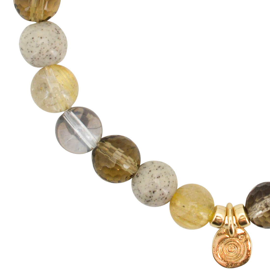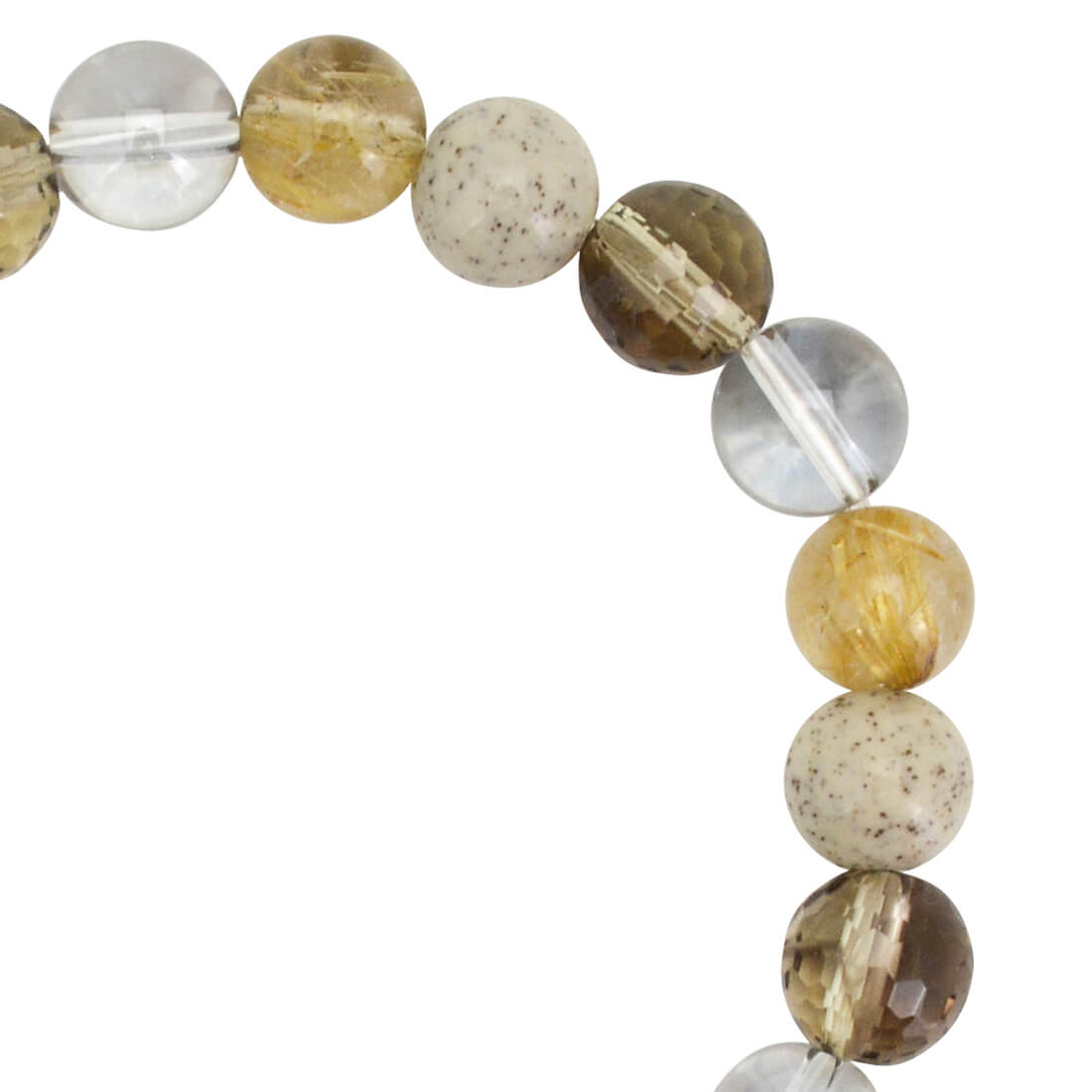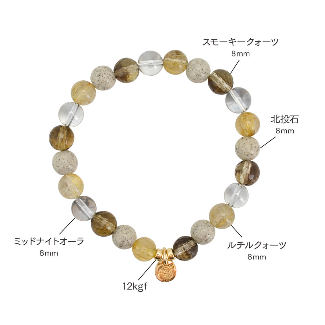 天使の髪、愛の矢を象徴する石とされ、金運・仕事運アップを強力に高めるといわれるルチルクォーツや、エネルギーを活性化させ、癒しを与えるといわれている北投石、忍耐力をアップし、争いを鎮めるとされるスモーキークォーツ、自身の成長を促し、自信を与えてくれるといわれるミッドナイトオーラなどを組み合わせたブレスレットです。