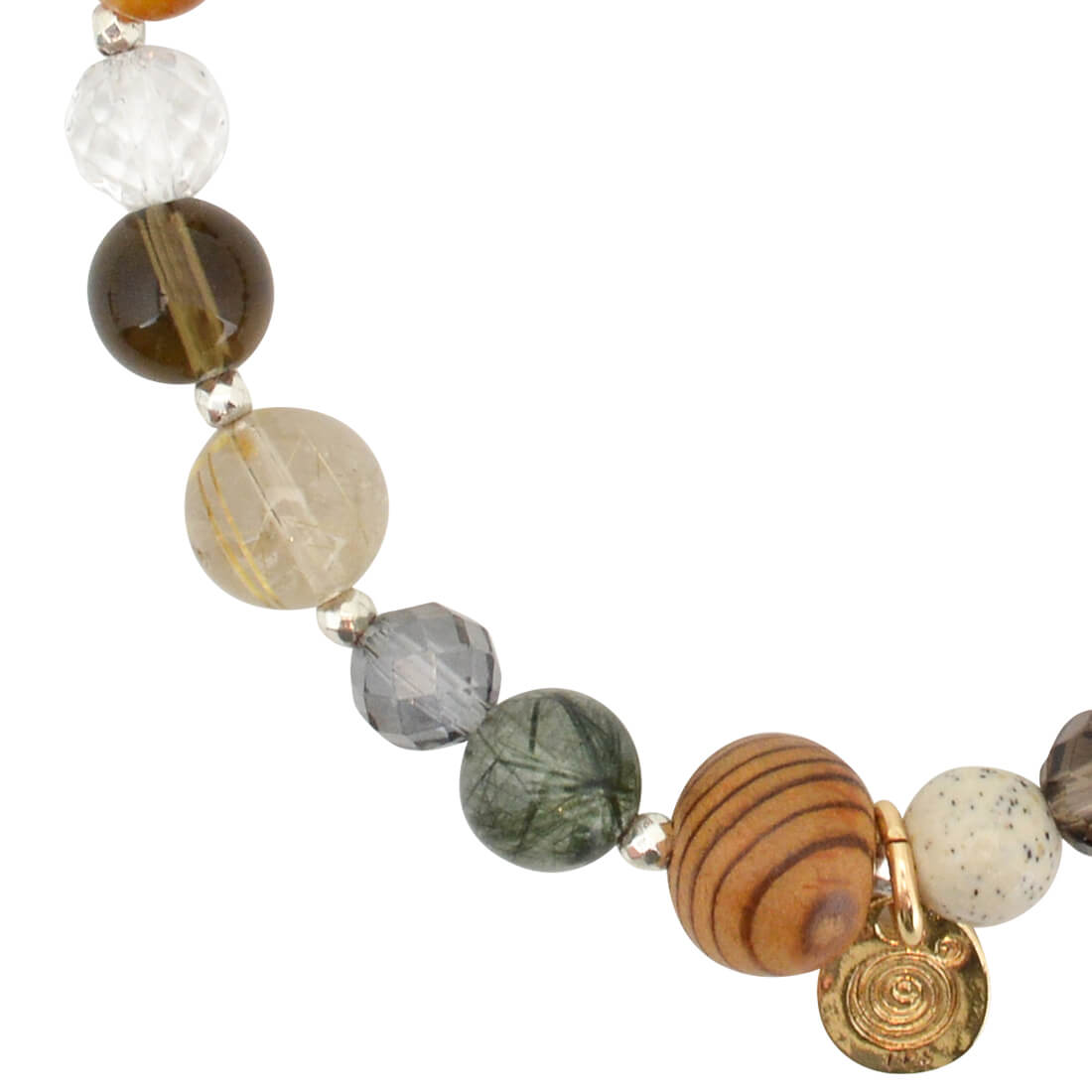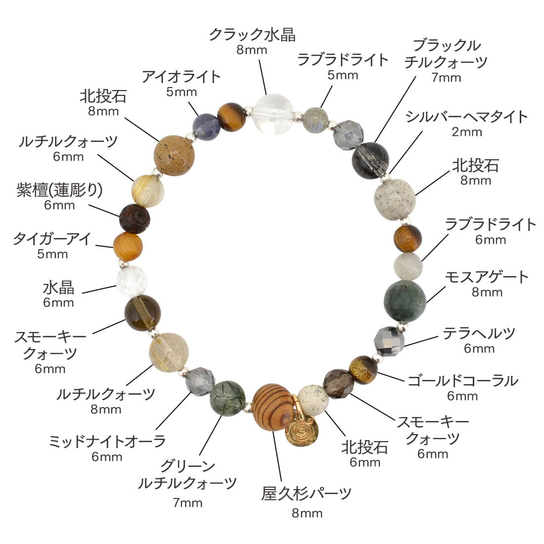 屋久杉パーツ+シルバーヘマタイト+グリーンルチルクォーツ+ミッドナイトオーラ+ルチルクォーツ+スモーキークォーツ+水晶+タイガーアイ+紫檀(蓮彫)+北投石+アイオライト+クラック水晶+ラブラドライト+ブラックルチルクォーツ+モスアゲート+テラヘルツ+ゴールドコーラル+オリジナルメダルチャーム