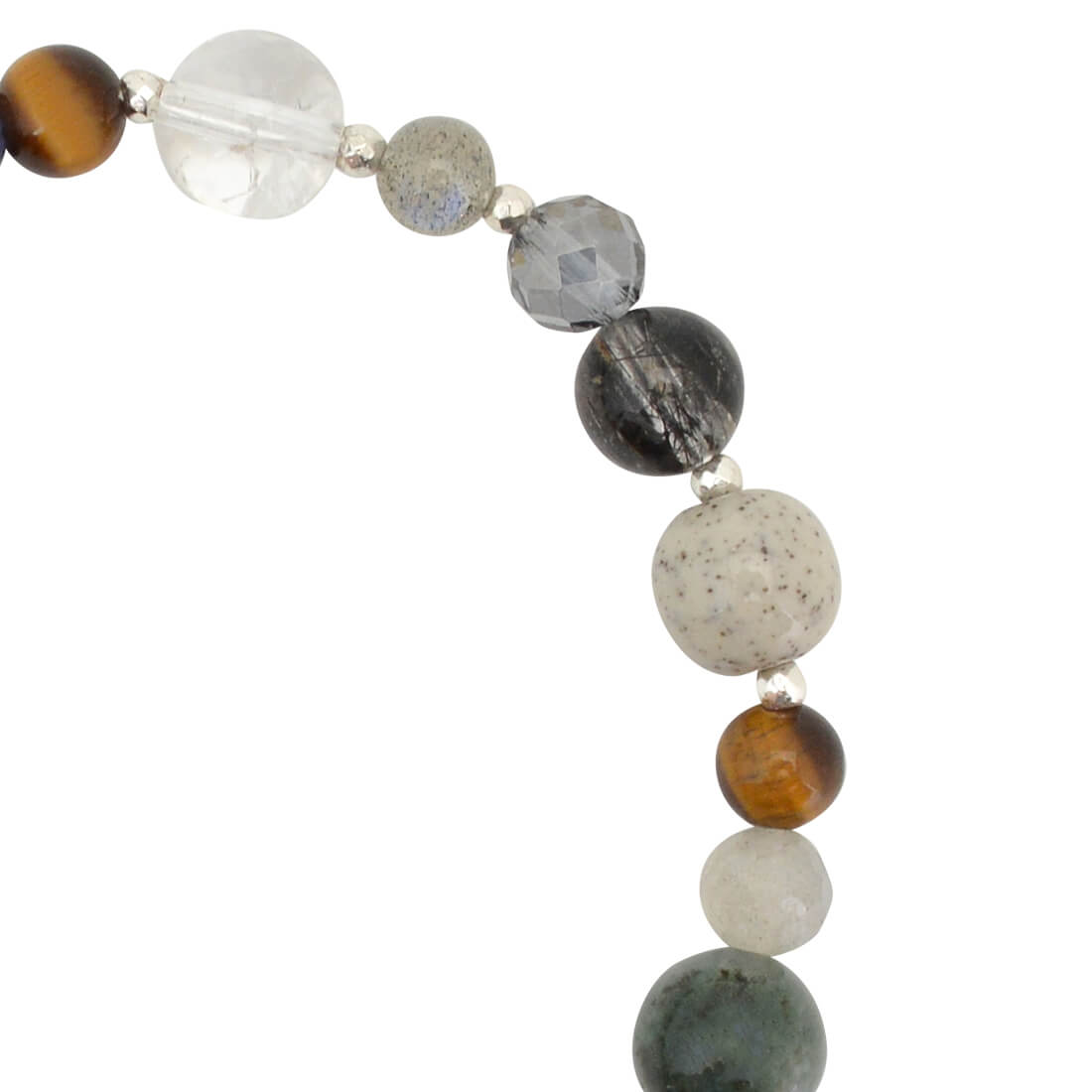 天使の髪、愛の矢を象徴する石とされ、金運・仕事運アップを強力に高めるといわれるルチルクォーツや、自身の成長を促し、自信を与えてくれるといわれるミッドナイトオーラ、忍耐力をアップし、争いを鎮めるとされるスモーキークォーツ、潜在能力を活性化させ、魔除けの作用を持つ万能パワーストーンとされる水晶などを組み合わせたブレスレットです。