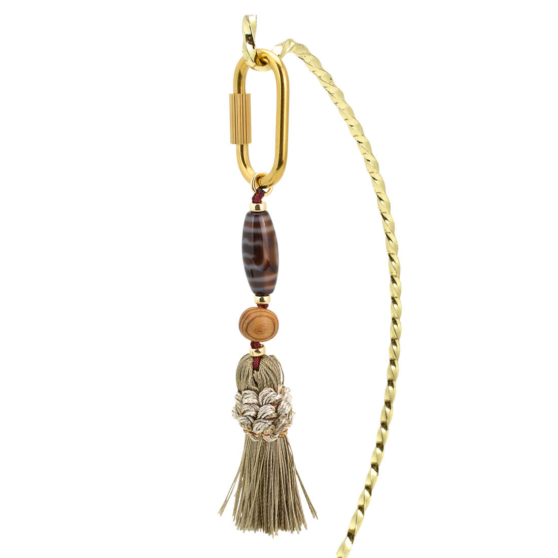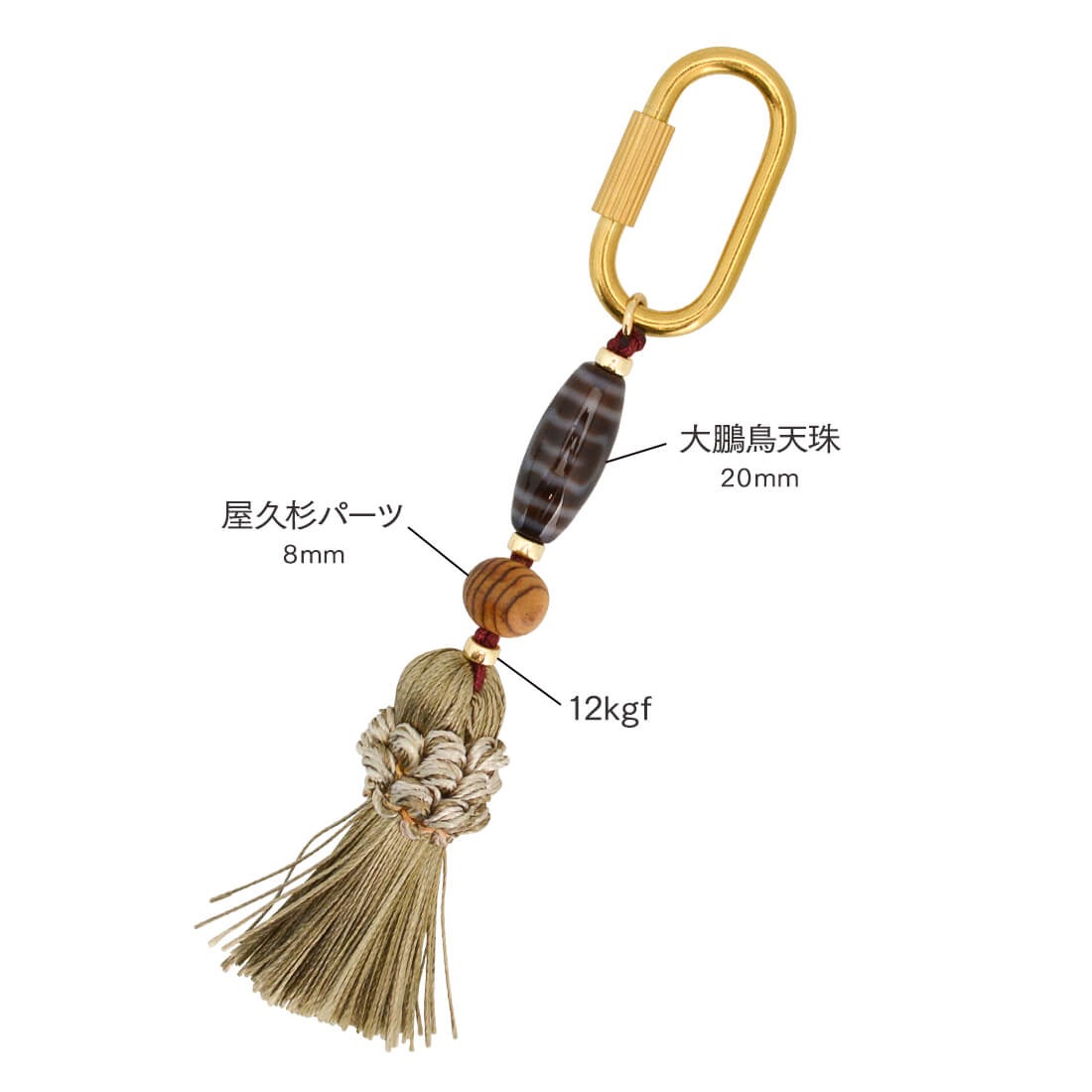 事故や天災などから身を守り、人間関係や仕事などのトラブルを未然に防ぐといわれている大鵬鳥天珠などを組み合わせたキーホルダーです。
