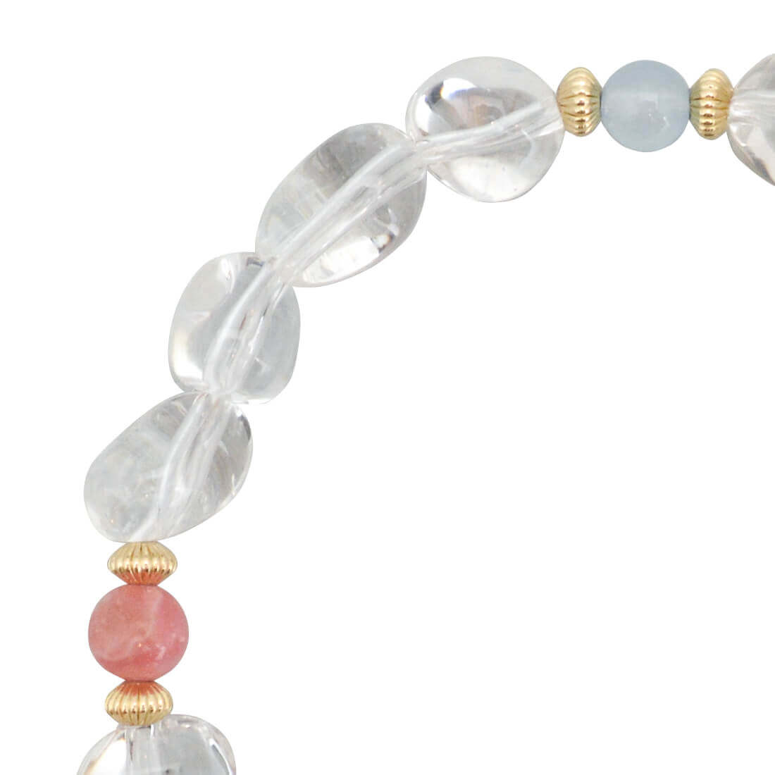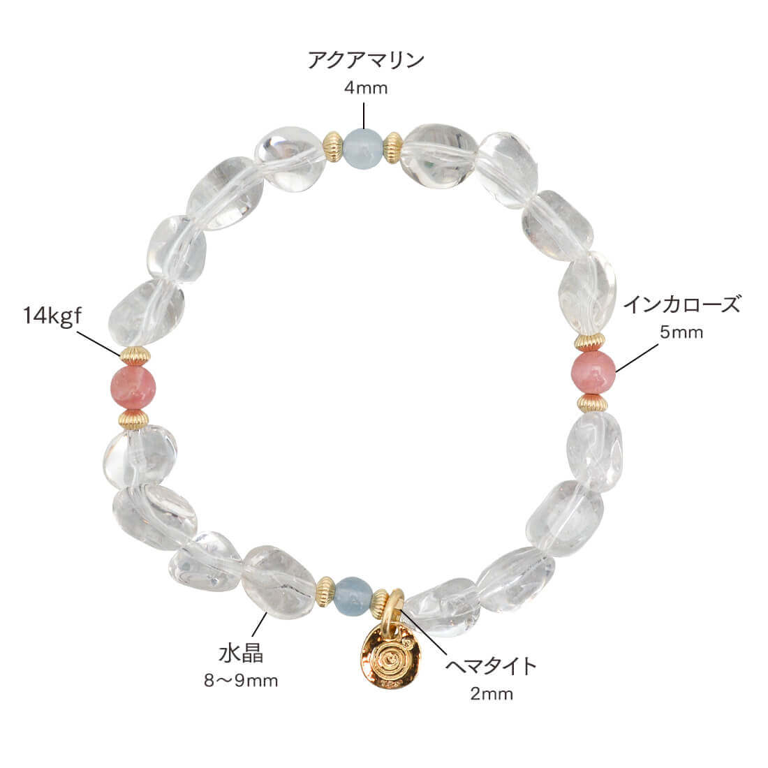 潜在能力を活性化させ、魔除けの作用を持つ万能パワーストーンとされる水晶や、清らかな癒しのエネルギーで満たしてくれるとされるアクアマリン、傷ついた過去を払拭させるといわれているインカローズ、目標を達成し、勝利へ導く石とされるヘマタイトなどを組み合わせたブレスレットです。