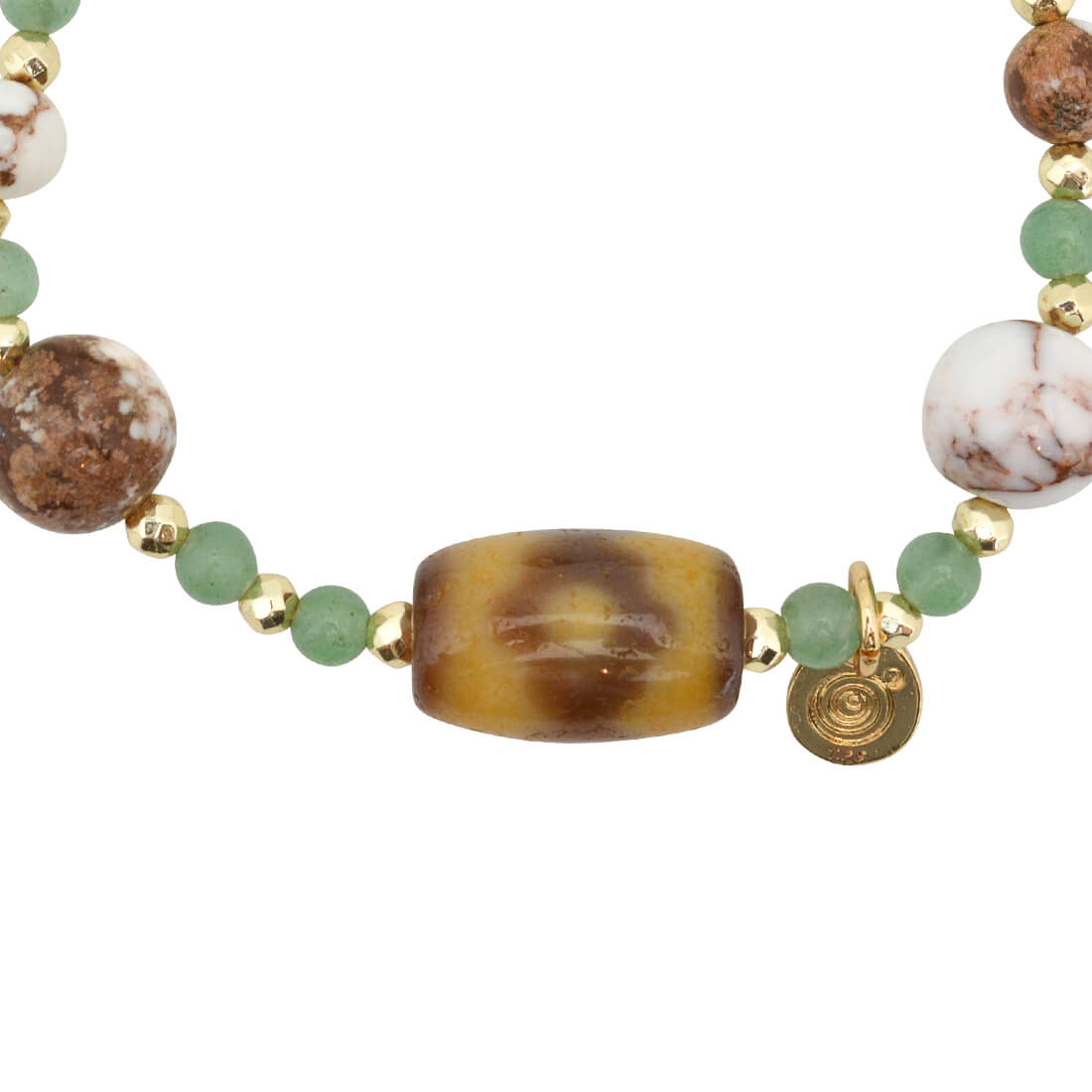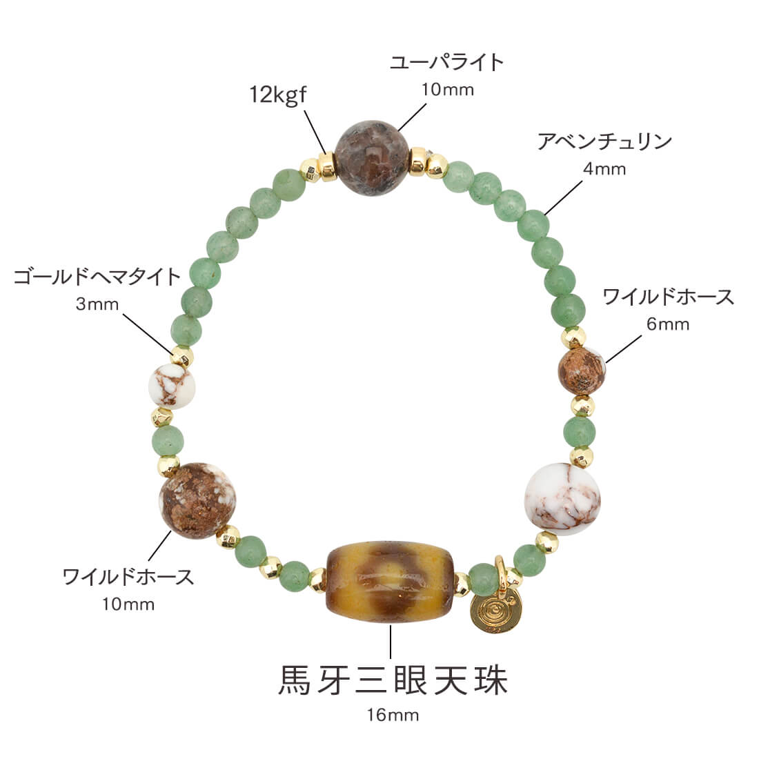 良い人間関係を築き助力してくれる人を呼び寄せ、財を成すといわれている馬牙三眼天珠に、人間関係・家庭円満・洞察力アップによいとされ、感情を安定させるといわれているアベンチュリンや、褐色と白色の模様が特徴で、幸運を引き寄せ奇跡を起こし、災いから守るといわれているワイルドホース、不安や恐怖、悲しみといった負の感情を和らげる効果があるといわれ、UVライトの照射によってピンクなどに蛍光するユーパライト、持ち主の身を守り生命力を高めるとされ、金運・勝負運アップによいといわれているゴールドヘマタイトなどを組み合わせたブレスレットです。
