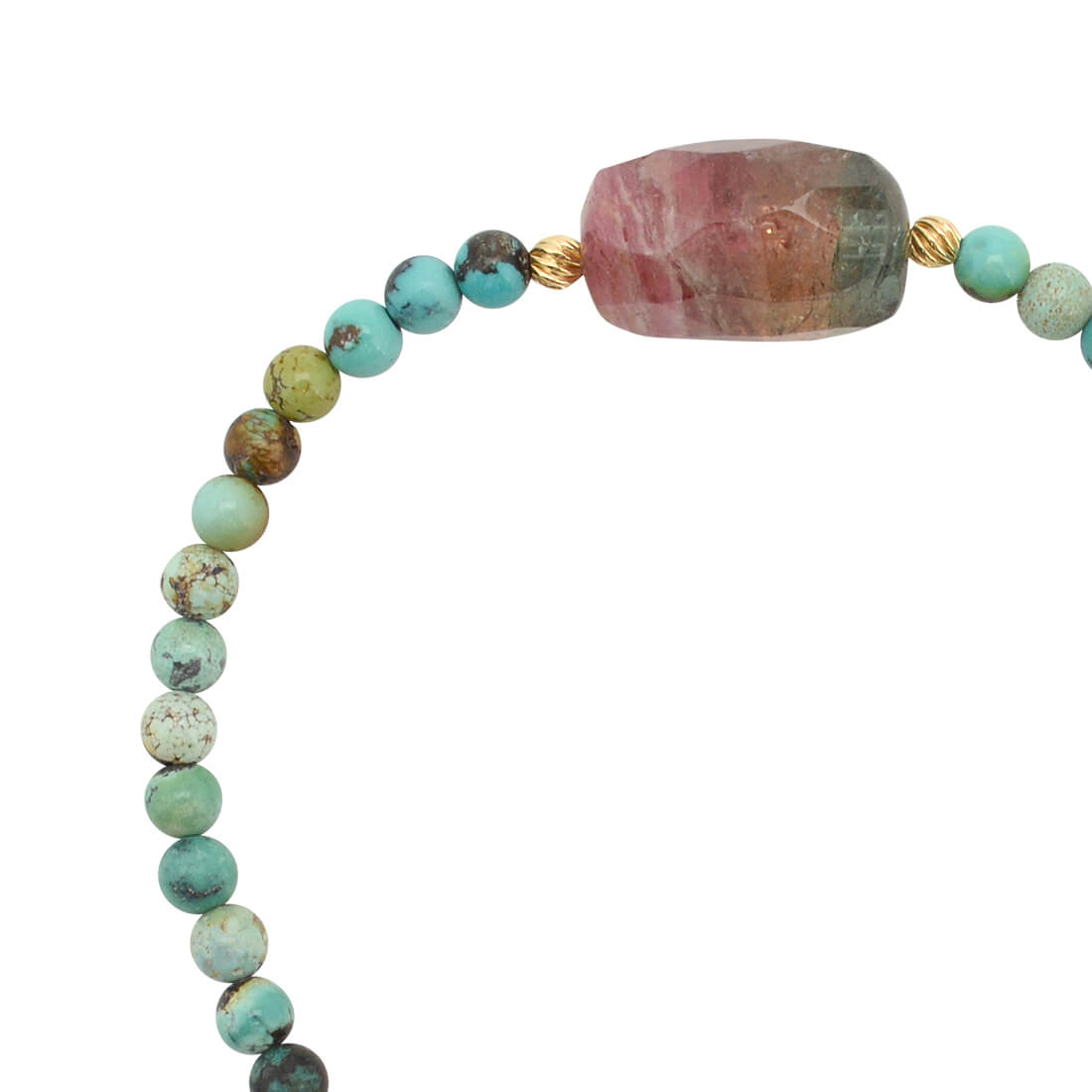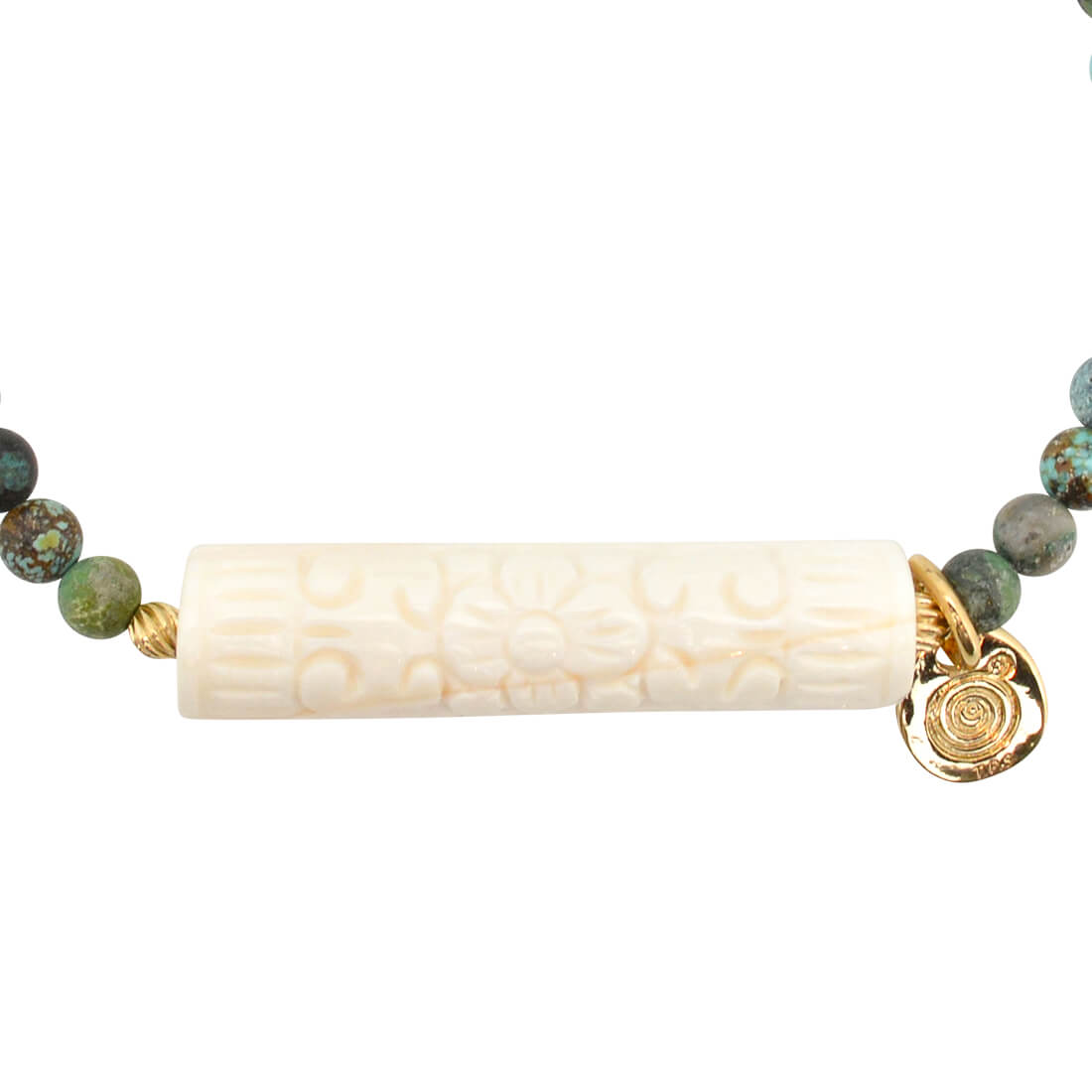 体に有害な電磁波を防ぎマイナスイオンを発生させ、癒しを与えるとされるトルマリンや、旅の守護石とされ、夢を持つ人に積極性を授け成功に導くといわれるターコイズなどを組み合わせたブレスレットです。