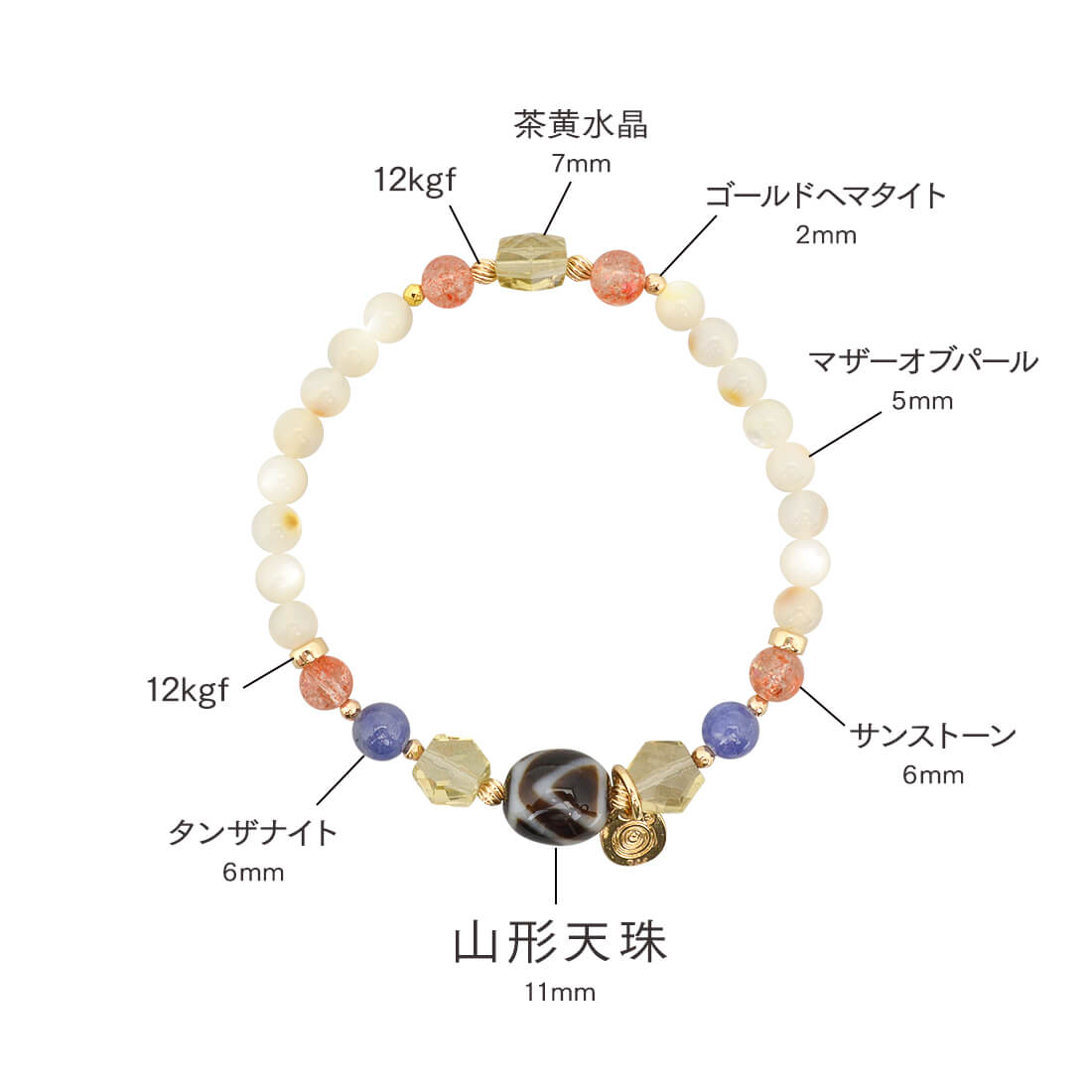 抱えている問題や障害を乗り越え、平穏な日々が歩めるようになるといわれている山形天珠に、健康を維持し散財を防ぎ、他人からの邪気を寄せつけないとされる茶黄水晶や、周囲からの影響を受けずに、人生を良い方向へと導くとされるタンザナイト、マイナスのエネルギーをプラスに変え、あらゆる行動の勝利を導くといわれるサンストーン、子宝や繁栄の象徴として、女性の魅力を高める石とされるマザーオブパール、持ち主の身を守り生命力を高めるとされ、金運・勝負運アップによいといわれているゴールドヘマタイトなどを組み合わせたブレスレットです。