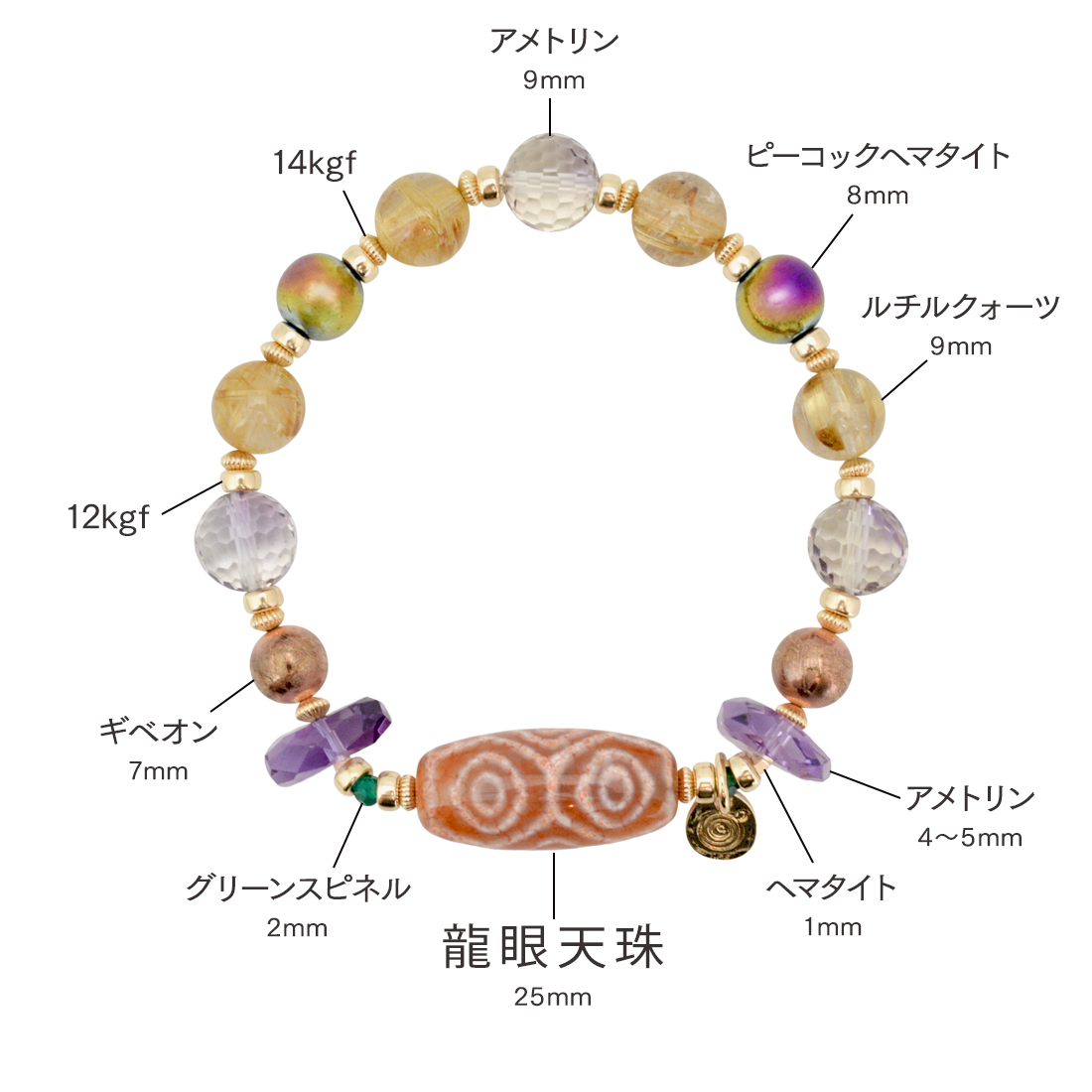 あらゆる運気が向上。苦難を排除し、特に権力・富財が増大するといわれている龍眼天珠に、財力・権力に恵まれ、富やチャンスを引き寄せるとされるスピネルや、人との繋がりを深めると共に、心身に癒しを与えるとされるアメトリン、天使の髪、愛の矢を象徴する石とされ、金運・仕事運アップを強力に高めるといわれるルチルクォーツ、ストレスを軽減させ、精神力や独創的な思考を高めるといわれるピーコックヘマタイト、目標を達成し、勝利へ導く石とされるヘマタイトなどを組み合わせたブレスレットです。