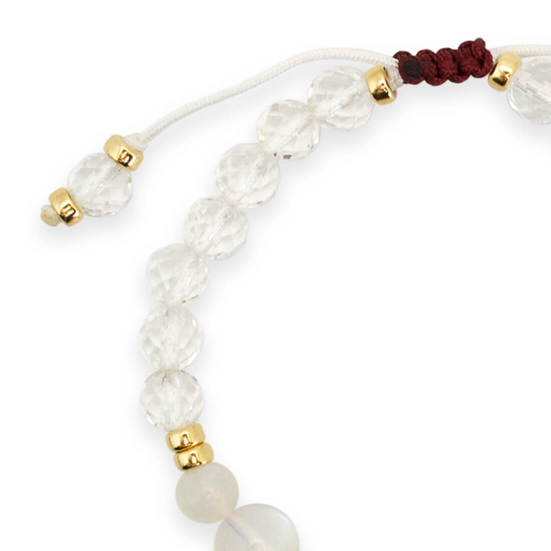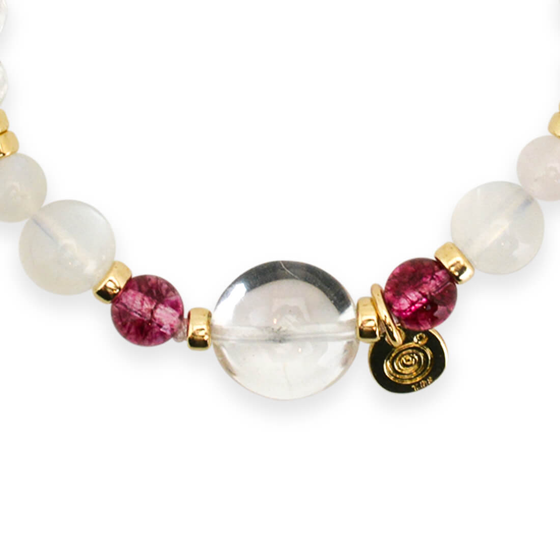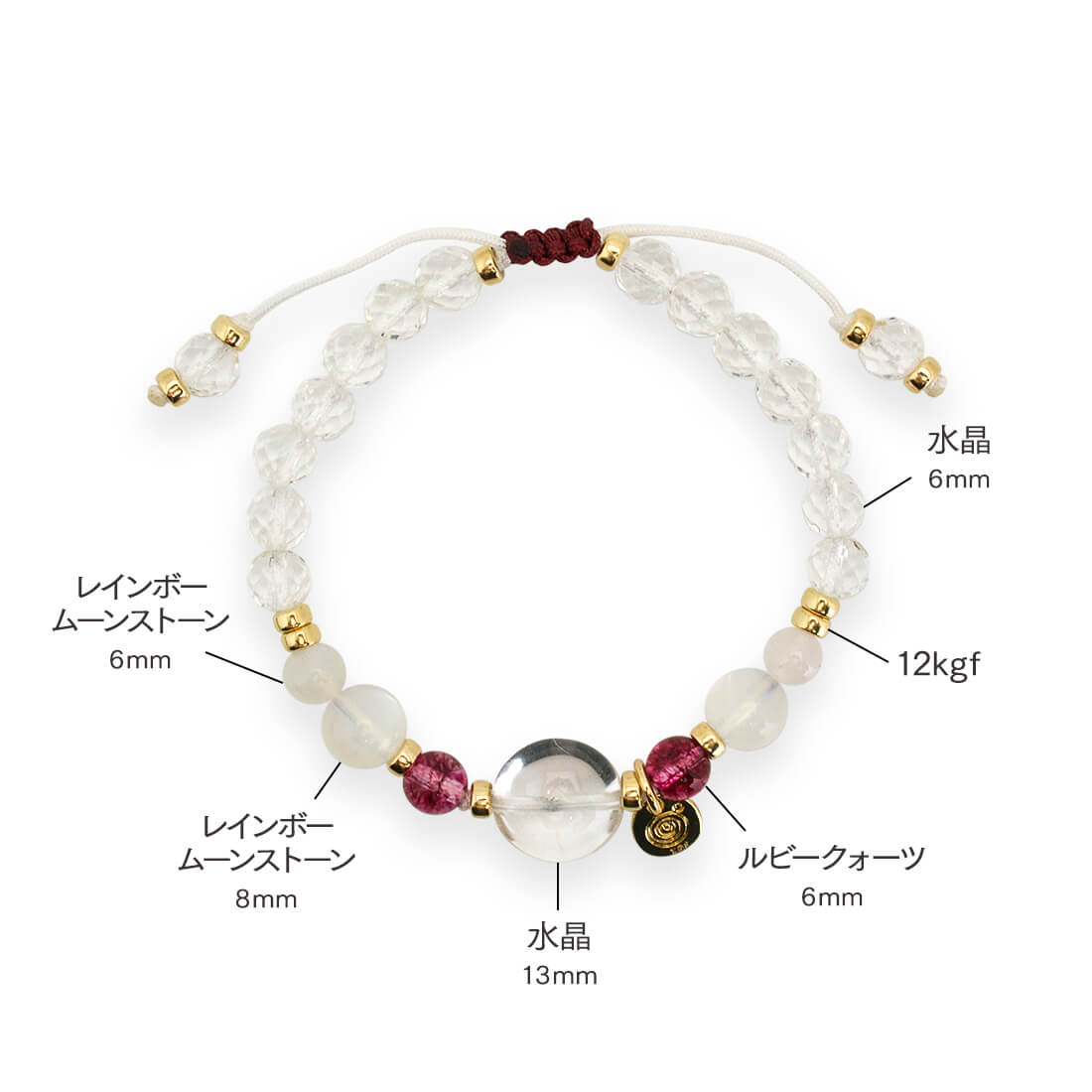 潜在能力を活性化させ、魔除けの作用を持つ万能パワーストーンとされる水晶や、意識の変革や静かな直観力・洞察力を養うとされ幸運を呼び込むといわれるレインボームーンストーンなどを組み合わせたブレスレットです。